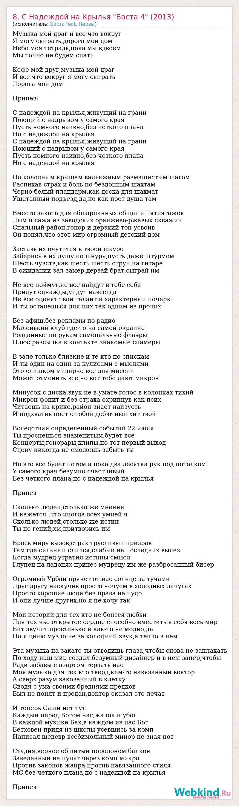 Музыка мой драг и все что вокруг Я могу сыграть,дорога мой дом Небо моя тетрадь,пока мы вдвоем Мы точно не будем спать Кофе мой друг,музыка мой драг И все что вокруг я могу сыграть Дорога мой дом Припев: С надеждой на крылья,живущий на грани Поющий с надрывом у самого края Пусть немного наивно,без четкого плана Но с надеждой на крылья С надеждой на крылья,живущий на грани Поющий с надрывом у самого края Пусть немного наивно,без четкого плана Но с надеждой на крылья По холодным крышам вальяжным размашистым шагом Распихав страх и боль по бездонным шахтам Черно-белый плацдарм,как доска для шахмат Ушатанный подъезд,да,но как поет душа там Вместо заката для обшарпанных общаг и пятиэтажек Дым и сажа из заводских оранжево-ржавых скважин Спальный район,гонор и дерзкий тон усвоив Он понял,что этот мир огромный детский дом Заставь их очутится в твоей шкуре Заберись в их душу по шнуру,пусть даже штурмом Шесть чувств,как шесть шесть струн на гитаре В ожидании зал замер,дерзай брат,сыграй им Не все поймут,не все найдут в тебе себя Придут однажды,уйдут навсегда Не все оценят твой талант и характерный почерк И ты останешься для них так одним из прочих Без афиш,без рекламы по радио Маленький клуб где-то на самой окраине Розданные по рукам самопальные флаэры Плюс разсылка в контакте знакомые спамеры В зале только близкие и те кто по спискам И ты один на один за кулисами с мыслями Это слишком мизирно все для миссии Может отменить все,но вот тебе дают микрон Минусок с диска,звук не в умате,голос в колонках тихий Микрон фонит и без страха охрипнув как псих Читаешь на крике,район знает наизусть И подхватив поет с тобой дебютный хит твой Вследствии определенный событий 22 июля Ты проснешься знаменитым,будет все Концерты,гонорары,клипы,но тот первый выход Сцену никогда не сможешь забыть ты Но это все будет потом,а пока два десятка рук под потолком У самого края безумно счастливый Без четкого плана,но с надеждой на крылья Припев Сколько людей,столько же мнений И кажется ,что иногда всех умней я Сколько людей,столько же истин Ты не гений,хм,притворись им Брось миру вызов,страх трусливый призрак Там где сильный слился,слабый на последних вылез Когда мудрец утратил истины смысл Глупец на ладонях принес мудрецу им же разбросанный бисер Огромный Урбан прячет от нас солнце за тучами Друг другу наскучив просто ночуем в холодных лачугах Просто хорошие люди без права на чудо И они лучше других,но я не хочу так Мои истории для тех кто не боится любви Для тех чье открытое сердце способно вместить в себя весь мир Бит звучит простенько и как-то не модно,да Но я ценю музло не за холодный звук,а тепло в нем Эта музыка на закате ты отводишь глаза,чтобы снова не заплакать По ходу наш мир создал безумный дизайнер и в нем запер,чтобы Ради забавы с азартом терзать нас Моя музыка для тех кто тверд,кем-то навязанный вектор А сверх разум закованный в клетку Сводя с ума своими бреднями предков Был не понят и предан,доктор сказал это лечат И теперь Саши нет тут Каждый перед Богом наг,жалок и убог В каждой музыке Бах,в каждом из нас Бог Бетховен придя из школы усевшись за комп Написал шедевр всебимольный минор не зная нот Студия,вернее обшитый поролоном балкон Заведенный на пульт через комп микро Против законов жанра,против навязанного стиля МС без четкого плана,но с надеждой на крылья 