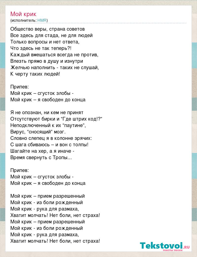 Общество веры, страна советов Все здесь для стада, не для людей Только вопросы и нет ответа, Что здесь не так теперь?! Каждый вмешаться всегда не против, Влезть прямо в душу и изнутри Желчью наполнить - таких не слушай, К черту таких людей! Припев: Мой крик – сгусток злобы - Мой крик – я свободен до конца Я не опознан, ни кем не принят Отсутствуют бирки и “Где штрих код!?” Неподключенный к их “паутине”, Вирус, “сносящий” мозг. Словно слепец я в колонне зрячих: С шага сбиваюсь – и вон с толпы! Шагайте на хер, а я иначе - Время свернуть с Тропы... Припев: Мой крик – сгусток злобы - Мой крик – я свободен до конца Мой крик – прием разрешенный Мой крик - из боли рожденный Мой крик - рука для размаха, Хватит молчать! Нет боли, нет страха! Мой крик – прием разрешенный Мой крик - из боли рожденный Мой крик - рука для размаха, Хватит молчать! Нет боли, нет страха!