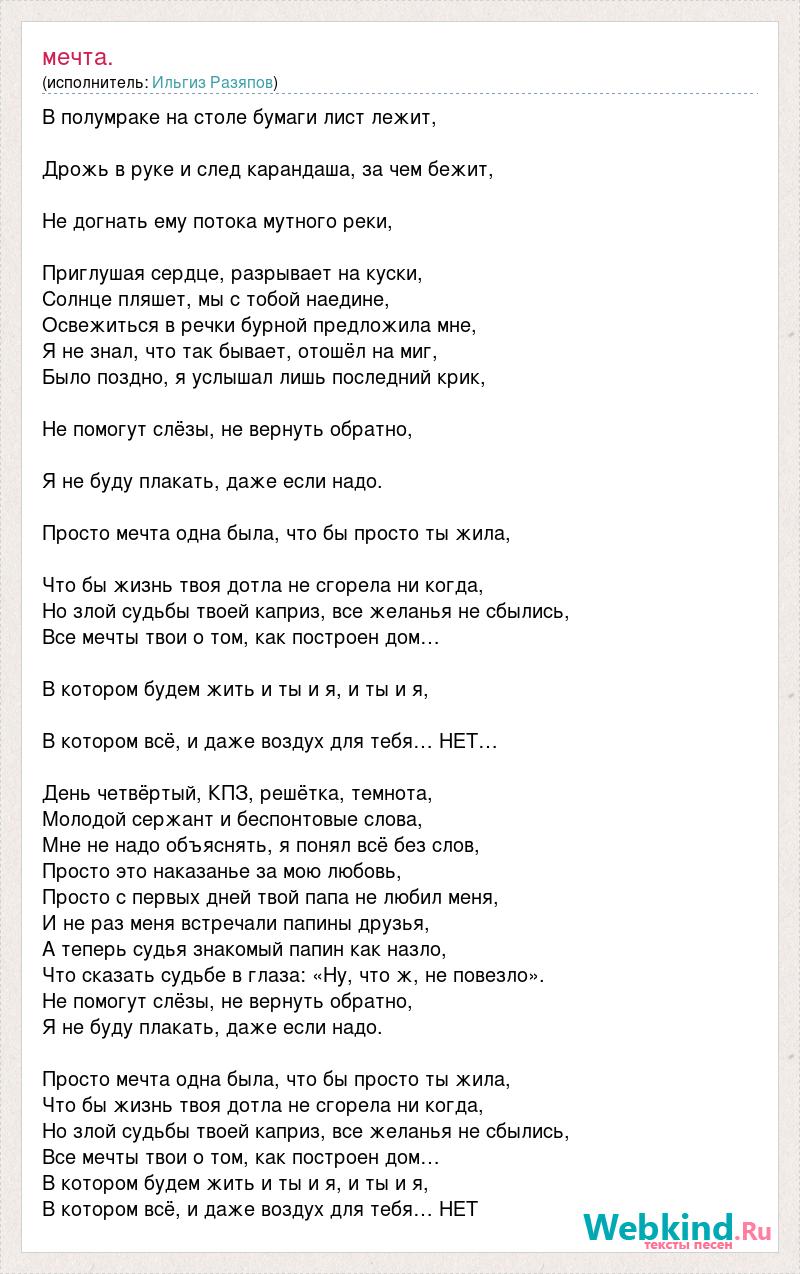 В полумраке на столе бумаги лист лежит, Дрожь в руке и след карандаша, за чем бежит, Не догнать ему потока мутного реки, Приглушая сердце, разрывает на куски, Солнце пляшет, мы с тобой наедине, Освежиться в речки бурной предложила мне, Я не знал, что так бывает, отошёл на миг, Было поздно, я услышал лишь последний крик, Не помогут слёзы, не вернуть обратно, Я не буду плакать, даже если надо. Просто мечта одна была, что бы просто ты жила, Что бы жизнь твоя дотла не сгорела ни когда, Но злой судьбы твоей каприз, все желанья не сбылись, Все мечты твои о том, как построен дом… В котором будем жить и ты и я, и ты и я, В котором всё, и даже воздух для тебя… НЕТ… День четвёртый, КПЗ, решётка, темнота, Молодой сержант и беспонтовые слова, Мне не надо объяснять, я понял всё без слов, Просто это наказанье за мою любовь, Просто с первых дней твой папа не любил меня, И не раз меня встречали папины друзья, А теперь судья знакомый папин как назло, Что сказать судьбе в глаза: «Ну, что ж, не повезло». Не помогут слёзы, не вернуть обратно, Я не буду плакать, даже если надо. Просто мечта одна была, что бы просто ты жила, Что бы жизнь твоя дотла не сгорела ни когда, Но злой судьбы твоей каприз, все желанья не сбылись, Все мечты твои о том, как построен дом… В котором будем жить и ты и я, и ты и я, В котором всё, и даже воздух для тебя… НЕТ
