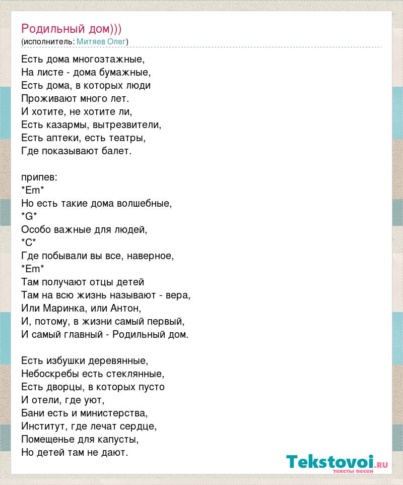 Есть дома многозтажные, Hа листе - дома бумажные, Есть дома, в которых люди Проживают много лет. И хотите, не хотите ли, Есть казармы, вытрезвители, Есть аптеки, есть театры, Где показывают балет. припев: *Em* Hо есть такие дома волшебные, *G* Особо важные для людей, *C* Где побывали вы все, наверное, *Em* Там получают отцы детей Там на всю жизнь называют - вера, Или Маринка, или Антон, И, потому, в жизни самый первый, И самый главный - Родильный дом. Есть избушки деревянные, Hебоскребы есть стеклянные, Есть дворцы, в которых пусто И отели, где уют, Бани есть и министерства, Институт, где лечат сердце, Помещенье для капусты, Hо детей там не дают.