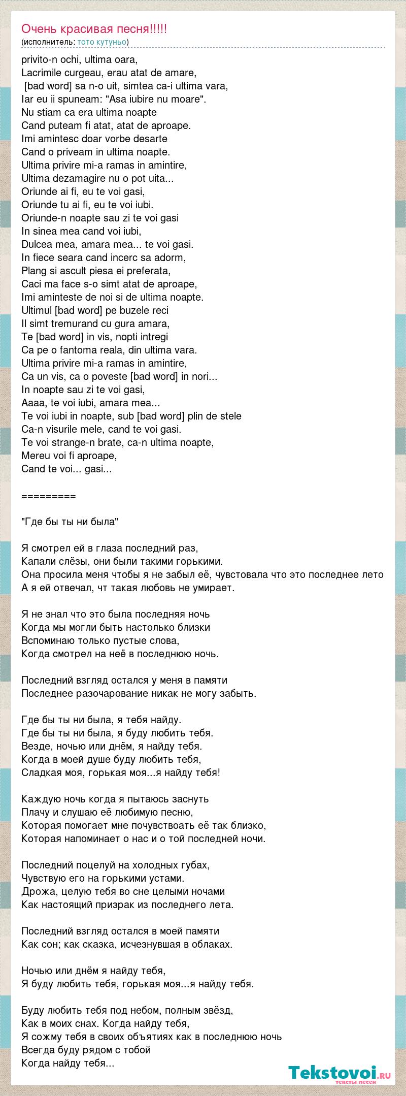privito-n ochi, ultima oara, Lacrimile curgeau, erau atat de amare, Ma ruga sa n-o uit, simtea ca-i ultima vara, Iar eu ii spuneam: "Asa iubire nu moare". Nu stiam ca era ultima noapte Cand puteam fi atat, atat de aproape. Imi amintesc doar vorbe desarte Cand o priveam in ultima noapte. Ultima privire mi-a ramas in amintire, Ultima dezamagire nu o pot uita... Oriunde ai fi, eu te voi gasi, Oriunde tu ai fi, eu te voi iubi. Oriunde-n noapte sau zi te voi gasi In sinea mea cand voi iubi, Dulcea mea, amara mea... te voi gasi. In fiece seara cand incerc sa adorm, Plang si ascult piesa ei preferata, Caci ma face s-o simt atat de aproape, Imi aminteste de noi si de ultima noapte. Ultimul sarut pe buzele reci Il simt tremurand cu gura amara, Te sarut in vis, nopti intregi Ca pe o fantoma reala, din ultima vara. Ultima privire mi-a ramas in amintire, Ca un vis, ca o poveste disparuta in nori... In noapte sau zi te voi gasi, Aaaa, te voi iubi, amara mea... Te voi iubi in noapte, sub cerul plin de stele Ca-n visurile mele, cand te voi gasi. Te voi strange-n brate, ca-n ultima noapte, Mereu voi fi aproape, Cand te voi... gasi... ========= "Где бы ты ни была" Я смотрел ей в глаза последний раз, Капали слёзы, они были такими горькими. Она просила меня чтобы я не забыл её, чувстовала что это последнее лето А я ей отвечал, чт такая любовь не умирает. Я не знал что это была последняя ночь Когда мы могли быть настолько близки Вспоминаю только пустые слова, Когда смотрел на неё в последнюю ночь. Последний взгляд остался у меня в памяти Последнее разочарование никак не могу забыть. Где бы ты ни была, я тебя найду. Где бы ты ни была, я буду любить тебя. Везде, ночью или днём, я найду тебя. Когда в моей душе буду любить тебя, Сладкая моя, горькая моя...я найду тебя! Каждую ночь когда я пытаюсь заснуть Плачу и слушаю её любимую песню, Которая помогает мне почувствоать её так близко, Которая напоминает о нас и о той последней ночи. Последний поцелуй на холодных губах, Чувствую его на горькими устами. Дрожа, целую тебя во сне целыми ночами Как настоящий призрак из последнего лета. Последний взгляд остался в моей памяти Как сон; как сказка, исчезнувшая в облаках. Ночью или днём я найду тебя, Я буду любить тебя, горькая моя...я найду тебя. Буду любить тебя под небом, полным звёзд, Как в моих снах. Когда найду тебя, Я сожму тебя в своих объятиях как в последнюю ночь Всегда буду рядом с тобой Когда найду тебя...