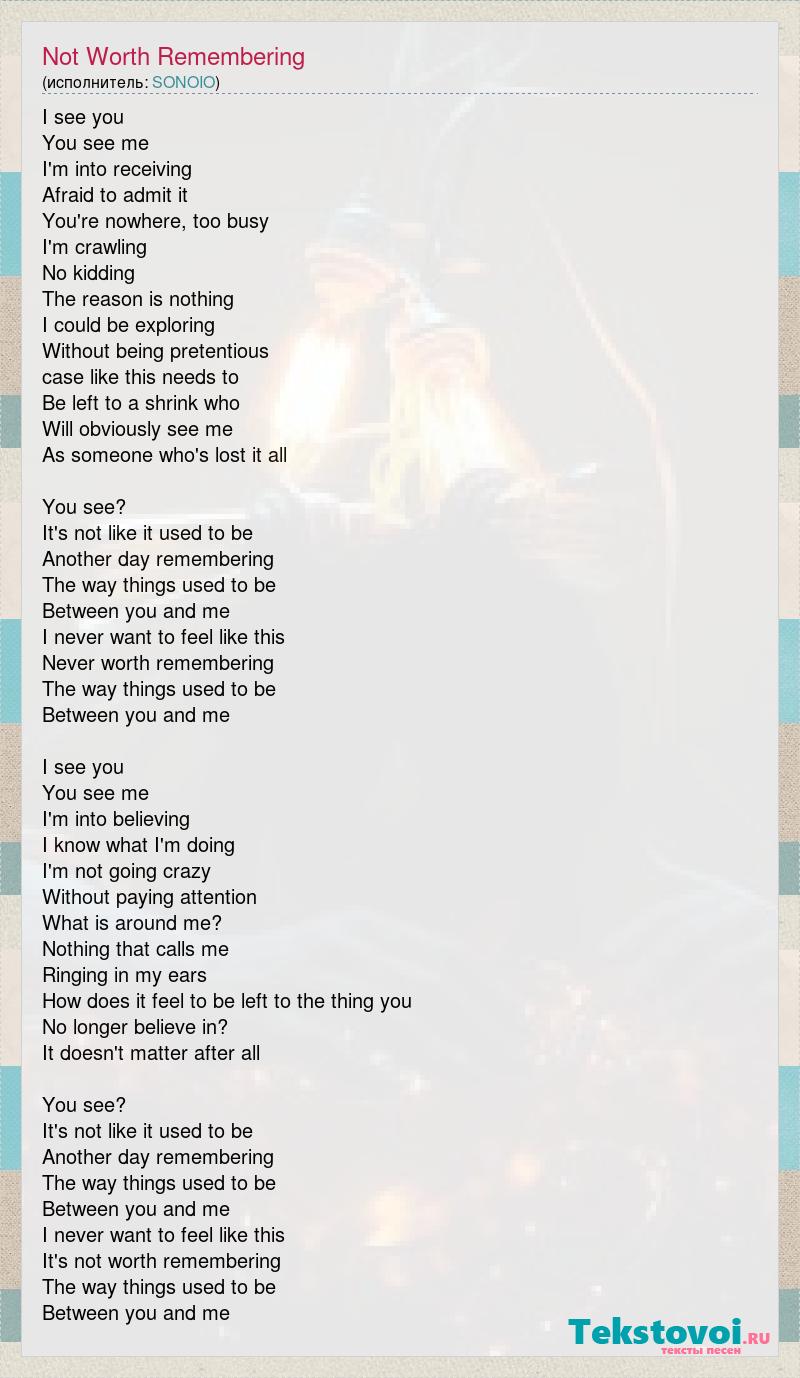 I see you You see me I'm into receiving Afraid to admit it You're nowhere, too busy I'm crawling No kidding The reason is nothing I could be exploring Without being pretentious case like this needs to Be left to a shrink who Will obviously see me As someone who's lost it all You see? It's not like it used to be Another day remembering The way things used to be Between you and me I never want to feel like this Never worth remembering The way things used to be Between you and me I see you You see me I'm into believing I know what I'm doing I'm not going crazy Without paying attention What is around me? Nothing that calls me Ringing in my ears How does it feel to be left to the thing you No longer believe in? It doesn't matter after all You see? It's not like it used to be Another day remembering The way things used to be Between you and me I never want to feel like this It's not worth remembering The way things used to be Between you and me
