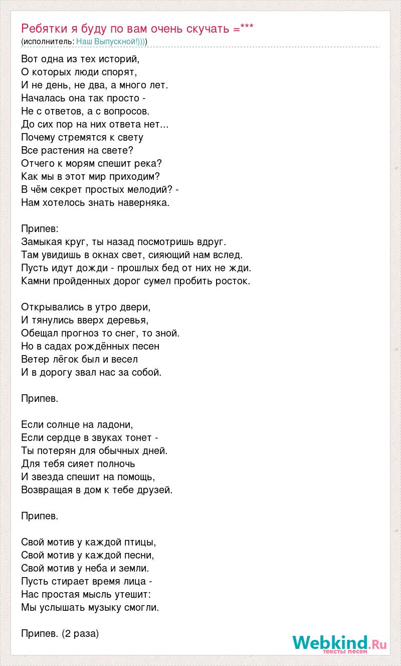 Вот одна из тех историй, О которых люди спорят, И не день, не два, а много лет. Началась она так просто - Не с ответов, а с вопросов. До сих пор на них ответа нет... Почему стремятся к свету Все растения на свете? Отчего к морям спешит река? Как мы в этот мир приходим? В чём секрет простых мелодий? - Нам хотелось знать наверняка. Припев: Замыкая круг, ты назад посмотришь вдруг. Там увидишь в окнах свет, сияющий нам вслед. Пусть идут дожди - прошлых бед от них не жди. Камни пройденных дорог сумел пробить росток. Открывались в утро двери, И тянулись вверх деревья, Обещал прогноз то снег, то зной. Но в садах рождённых песен Ветер лёгок был и весел И в дорогу звал нас за собой. Припев. Если солнце на ладони, Если сердце в звуках тонет - Ты потерян для обычных дней. Для тебя сияет полночь И звезда спешит на помощь, Возвращая в дом к тебе друзей. Припев. Свой мотив у каждой птицы, Свой мотив у каждой песни, Свой мотив у неба и земли. Пусть стирает время лица - Нас простая мысль утешит: Мы услышать музыку смогли. Припев. (2 раза)