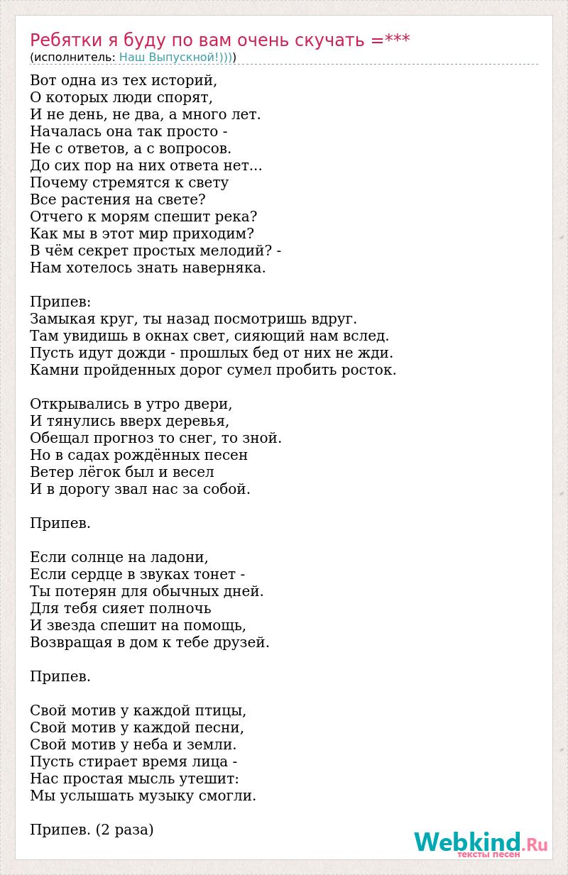 Вот одна из тех историй, О которых люди спорят, И не день, не два, а много лет. Началась она так просто - Не с ответов, а с вопросов. До сих пор на них ответа нет... Почему стремятся к свету Все растения на свете? Отчего к морям спешит река? Как мы в этот мир приходим? В чём секрет простых мелодий? - Нам хотелось знать наверняка. Припев: Замыкая круг, ты назад посмотришь вдруг. Там увидишь в окнах свет, сияющий нам вслед. Пусть идут дожди - прошлых бед от них не жди. Камни пройденных дорог сумел пробить росток. Открывались в утро двери, И тянулись вверх деревья, Обещал прогноз то снег, то зной. Но в садах рождённых песен Ветер лёгок был и весел И в дорогу звал нас за собой. Припев. Если солнце на ладони, Если сердце в звуках тонет - Ты потерян для обычных дней. Для тебя сияет полночь И звезда спешит на помощь, Возвращая в дом к тебе друзей. Припев. Свой мотив у каждой птицы, Свой мотив у каждой песни, Свой мотив у неба и земли. Пусть стирает время лица - Нас простая мысль утешит: Мы услышать музыку смогли. Припев. (2 раза)