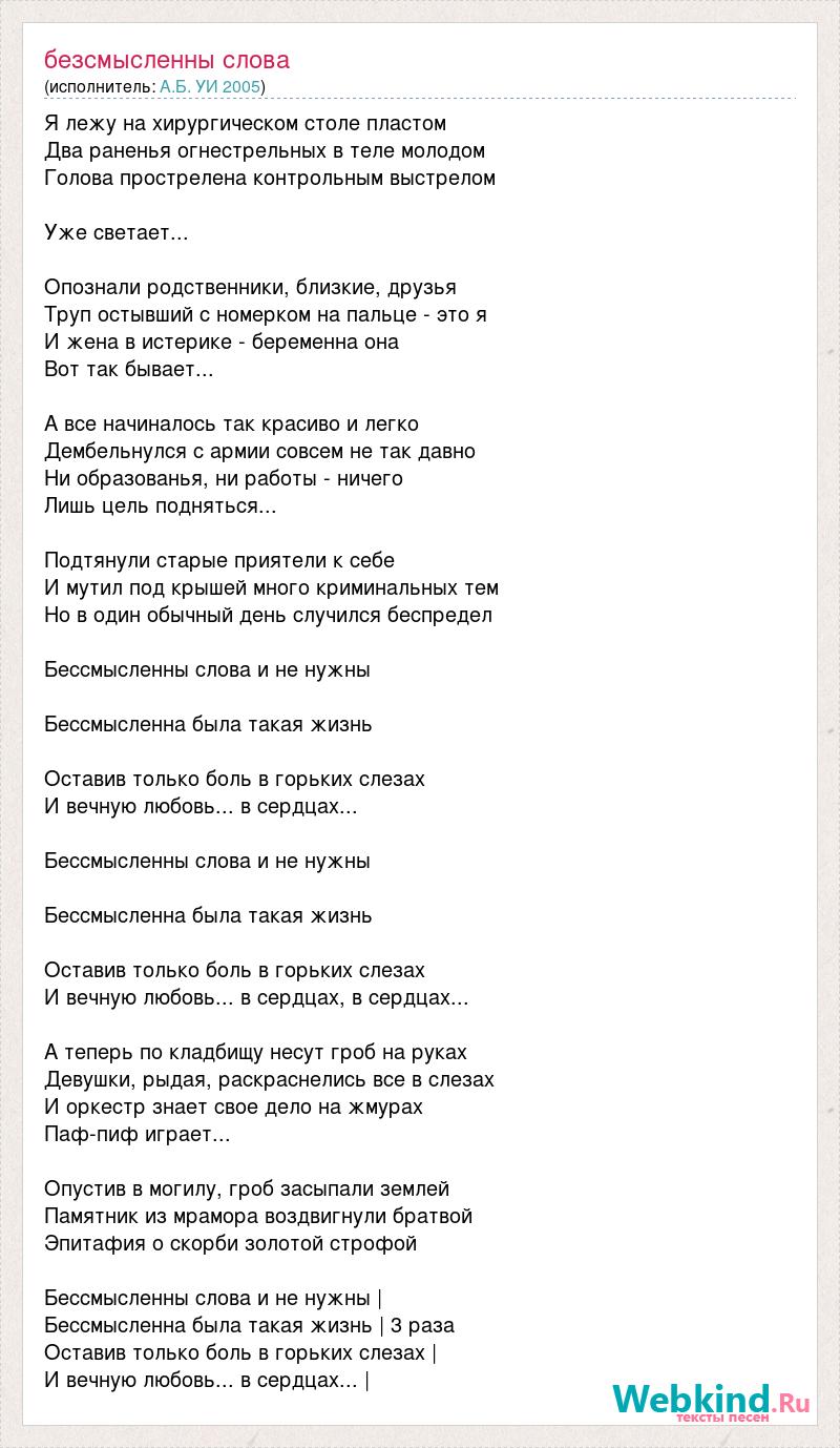 Я лежу на хирургическом столе пластом Два раненья огнестрельных в теле молодом Голова прострелена контрольным выстрелом Уже светает... Опознали родственники, близкие, друзья Труп остывший с номерком на пальце - это я И жена в истерике - беременна она Вот так бывает... А все начиналось так красиво и легко Дембельнулся с армии совсем не так давно Ни образованья, ни работы - ничего Лишь цель подняться... Подтянули старые приятели к себе И мутил под крышей много криминальных тем Но в один обычный день случился беспредел Бессмысленны слова и не нужны Бессмысленна была такая жизнь Оставив только боль в горьких слезах И вечную любовь... в сердцах... Бессмысленны слова и не нужны Бессмысленна была такая жизнь Оставив только боль в горьких слезах И вечную любовь... в сердцах, в сердцах... А теперь по кладбищу несут гроб на руках Девушки, рыдая, раскраснелись все в слезах И оркестр знает свое дело на жмурах Паф-пиф играет... Опустив в могилу, гроб засыпали землей Памятник из мрамора воздвигнули братвой Эпитафия о скорби золотой строфой Бессмысленны слова и не нужны | Бессмысленна была такая жизнь | 3 раза Оставив только боль в горьких слезах | И вечную любовь... в сердцах... |