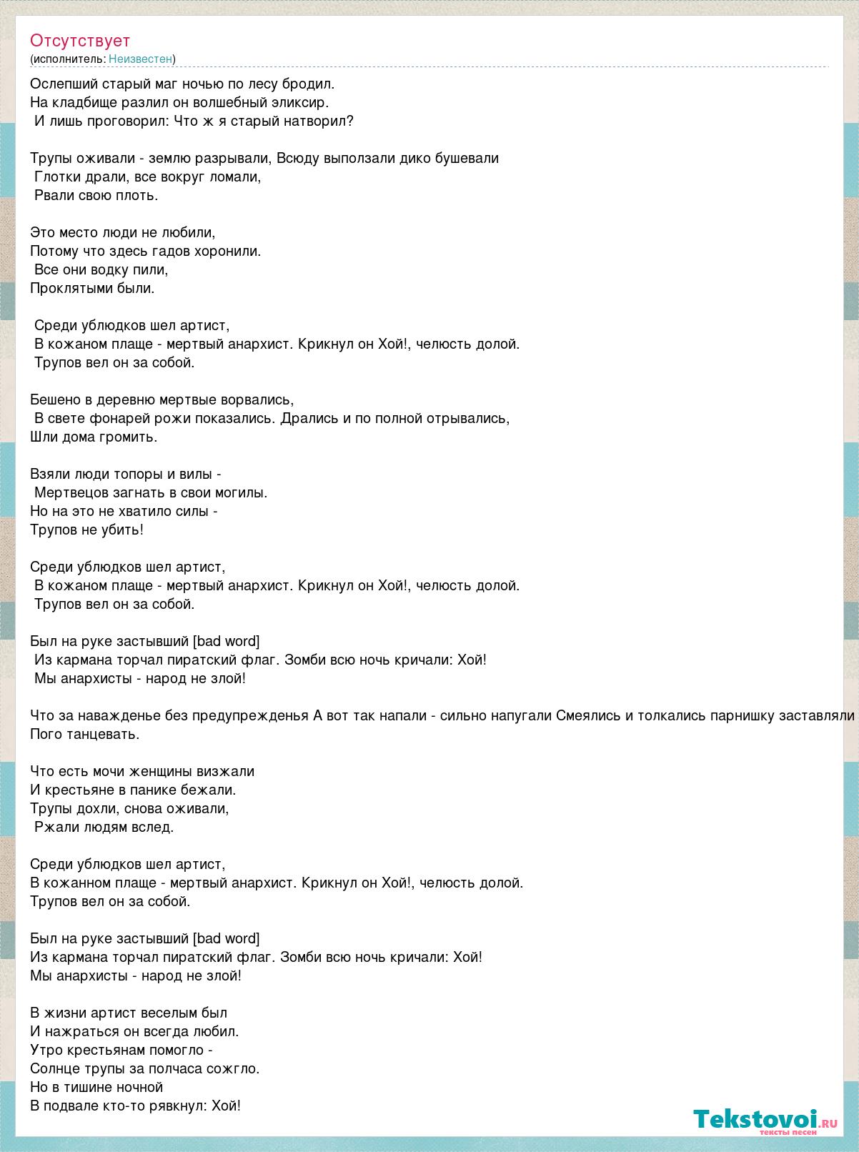 Ослепший старый маг ночью по лесу бродил. На кладбище разлил он волшебный эликсир. И лишь проговорил: Что ж я старый натворил? Трупы оживали - землю разрывали, Всюду выползали дико бушевали Глотки драли, все вокруг ломали, Рвали свою плоть. Это место люди не любили, Потому что здесь гадов хоронили. Все они водку пили, Проклятыми были. Среди ублюдков шел артист, В кожаном плаще - мертвый анархист. Крикнул он Хой!, челюсть долой. Трупов вел он за собой. Бешено в деревню мертвые ворвались, В свете фонарей рожи показались. Дрались и по полной отрывались, Шли дома громить. Взяли люди топоры и вилы - Мертвецов загнать в свои могилы. Но на это не хватило силы - Трупов не убить! Среди ублюдков шел артист, В кожаном плаще - мертвый анархист. Крикнул он Хой!, челюсть долой. Трупов вел он за собой. Был на руке застывший [bad word] Из кармана торчал пиратский флаг. Зомби всю ночь кричали: Хой! Мы анархисты - народ не злой! Что за наважденье без предупрежденья А вот так напали - сильно напугали Смеялись и толкались парнишку заставляли Пого танцевать. Что есть мочи женщины визжали И крестьяне в панике бежали. Трупы дохли, снова оживали, Ржали людям вслед. Среди ублюдков шел артист, В кожанном плаще - мертвый анархист. Крикнул он Хой!, челюсть долой. Трупов вел он за собой. Был на руке застывший [bad word] Из кармана торчал пиратский флаг. Зомби всю ночь кричали: Хой! Мы анархисты - народ не злой! В жизни артист веселым был И нажраться он всегда любил. Утро крестьянам помогло - Солнце трупы за полчаса сожгло. Но в тишине ночной В подвале кто-то рявкнул: Хой!