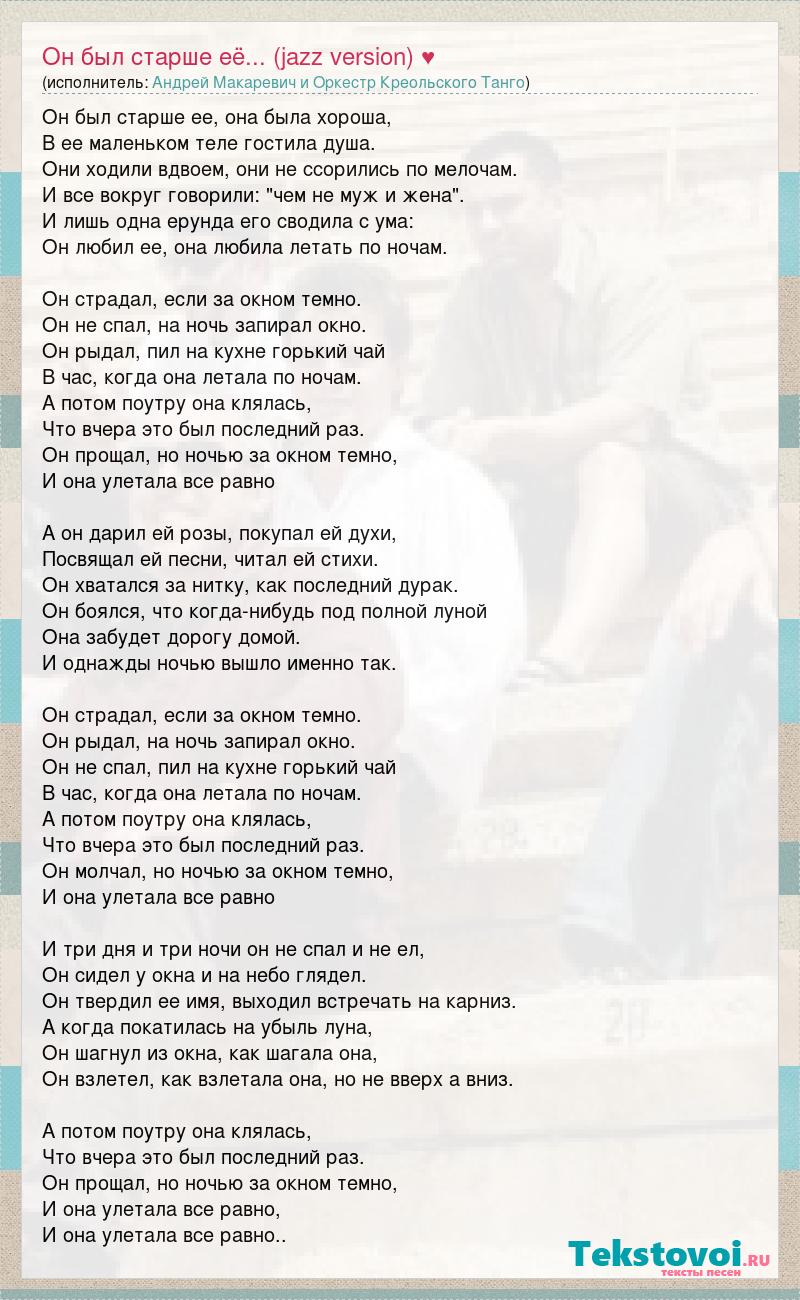 Он был старше ее, она была хороша, В ее маленьком теле гостила душа. Они ходили вдвоем, они не ссорились по мелочам. И все вокруг говорили: "чем не муж и жена". И лишь одна ерунда его сводила с ума: Он любил ее, она любила летать по ночам. Он страдал, если за окном темно. Он не спал, на ночь запирал окно. Он рыдал, пил на кухне горький чай В час, когда она летала по ночам. А потом поутру она клялась, Что вчера это был последний раз. Он прощал, но ночью за окном темно, И она улетала все равно А он дарил ей розы, покупал ей духи, Посвящал ей песни, читал ей стихи. Он хватался за нитку, как последний дурак. Он боялся, что когда-нибудь под полной луной Она забудет дорогу домой. И однажды ночью вышло именно так. Он страдал, если за окном темно. Он рыдал, на ночь запирал окно. Он не спал, пил на кухне горький чай В час, когда она летала по ночам. А потом поутру она клялась, Что вчера это был последний раз. Он молчал, но ночью за окном темно, И она улетала все равно И три дня и три ночи он не спал и не ел, Он сидел у окна и на небо глядел. Он твердил ее имя, выходил встречать на карниз. А когда покатилась на убыль луна, Он шагнул из окна, как шагала она, Он взлетел, как взлетала она, но не вверх а вниз. А потом поутру она клялась, Что вчера это был последний раз. Он прощал, но ночью за окном темно, И она улетала все равно, И она улетала все равно..