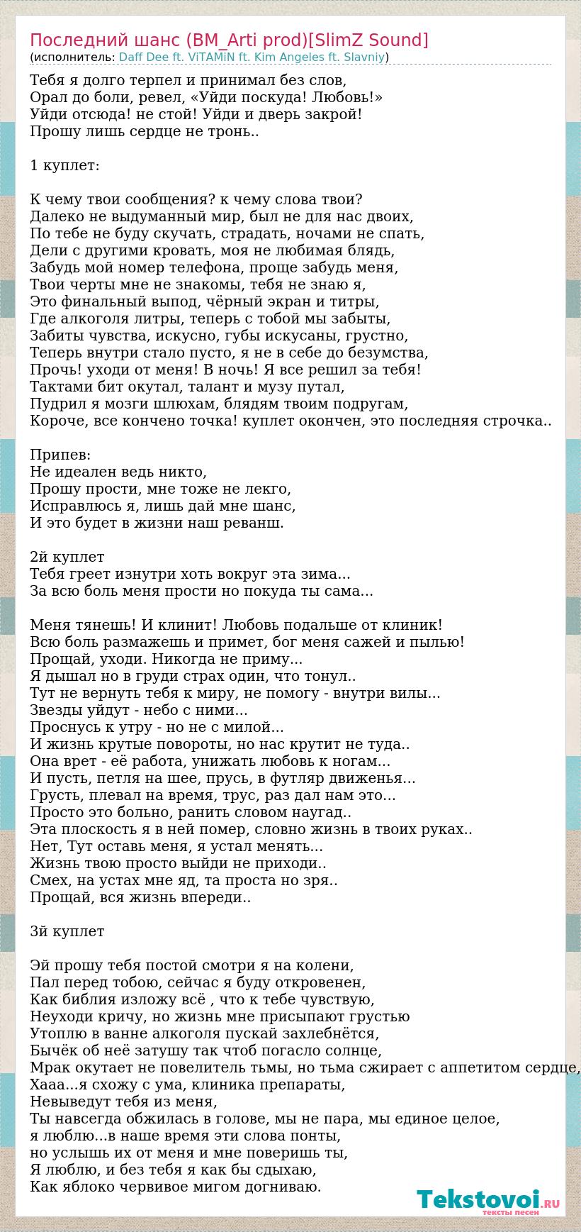 Тебя я долго терпел и принимал без слов, Орал до боли, ревел, «Уйди поскуда! Любовь!» Уйди отсюда! не стой! Уйди и дверь закрой! Прошу лишь сердце не тронь.. 1 куплет: К чему твои сообщения? к чему слова твои? Далеко не выдуманный мир, был не для нас двоих, По тебе не буду скучать, страдать, ночами не спать, Дели с другими кровать, моя не любимая блядь, Забудь мой номер телефона, проще забудь меня, Твои черты мне не знакомы, тебя не знаю я, Это финальный выпод, чёрный экран и титры, Где алкоголя литры, теперь с тобой мы забыты, Забиты чувства, искусно, губы искусаны, грустно, Теперь внутри стало пусто, я не в себе до безумства, Прочь! уходи от меня! В ночь! Я все решил за тебя! Тактами бит окутал, талант и музу путал, Пудрил я мозги шлюхам, блядям твоим подругам, Короче, все кончено точка! куплет окончен, это последняя строчка.. Припев: Не идеален ведь никто, Прошу прости, мне тоже не лекго, Исправлюсь я, лишь дай мне шанс, И это будет в жизни наш реванш. 2й куплет Тебя греет изнутри хоть вокруг эта зима... За всю боль меня прости но покуда ты сама... Меня тянешь! И клинит! Любовь подальше от клиник! Всю боль размажешь и примет, бог меня сажей и пылью! Прощай, уходи. Никогда не приму... Я дышал но в груди страх один, что тонул.. Тут не вернуть тебя к миру, не помогу - внутри вилы... Звезды уйдут - небо с ними... Проснусь к утру - но не с милой... И жизнь крутые повороты, но нас крутит не туда.. Она врет - её работа, унижать любовь к ногам... И пусть, петля на шее, прусь, в футляр движенья... Грусть, плевал на время, трус, раз дал нам это... Просто это больно, ранить словом наугад.. Эта плоскость я в ней помер, словно жизнь в твоих руках.. Нет, Тут оставь меня, я устал менять... Жизнь твою просто выйди не приходи.. Смех, на устах мне яд, та проста но зря.. Прощай, вся жизнь впереди.. 3й куплет Эй прошу тебя постой смотри я на колени, Пал перед тобою, сейчас я буду откровенен, Как библия изложу всё , что к тебе чувствую, Неуходи кричу, но жизнь мне присыпают грустью Утоплю в ванне алкоголя пускай захлебнётся, Бычёк об неё затушу так чтоб погасло солнце, Мрак окутает не повелитель тьмы, но тьма сжирает с аппетитом сердце, Хааа...я схожу с ума, клиника препараты, Невыведут тебя из меня, Ты навсегда обжилась в голове, мы не пара, мы единое целое, я люблю...в наше время эти слова понты, но услышь их от меня и мне поверишь ты, Я люблю, и без тебя я как бы сдыхаю, Как яблоко червивое мигом догниваю.