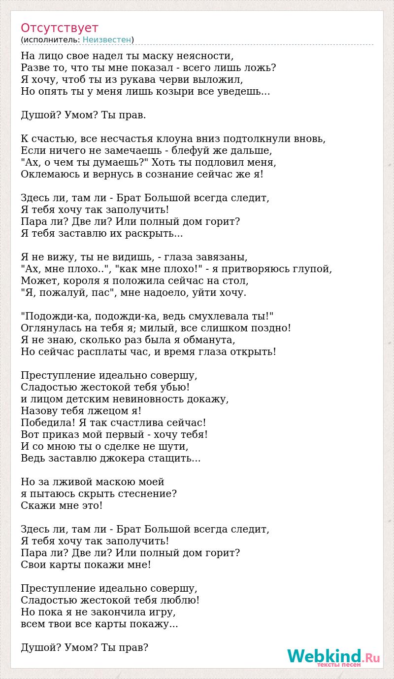 На лицо свое надел ты маску неясности, Разве то, что ты мне показал - всего лишь ложь? Я хочу, чтоб ты из рукава черви выложил, Но опять ты у меня лишь козыри все уведешь... Душой? Умом? Ты прав. К счастью, все несчастья клоуна вниз подтолкнули вновь, Если ничего не замечаешь - блефуй же дальше, "Ах, о чем ты думаешь?" Хоть ты подловил меня, Оклемаюсь и вернусь в сознание сейчас же я! Здесь ли, там ли - Брат Большой всегда следит, Я тебя хочу так заполучить! Пара ли? Две ли? Или полный дом горит? Я тебя заставлю их раскрыть... Я не вижу, ты не видишь, - глаза завязаны, "Ах, мне плохо..", "как мне плохо!" - я притворяюсь глупой, Может, короля я положила сейчас на стол, "Я, пожалуй, пас", мне надоело, уйти хочу. "Подожди-ка, подожди-ка, ведь смухлевала ты!" Оглянулась на тебя я; милый, все слишком поздно! Я не знаю, сколько раз была я обманута, Но сейчас расплаты час, и время глаза открыть! Преступление идеально совершу, Сладостью жестокой тебя убью! и лицом детским невиновность докажу, Назову тебя лжецом я! Победила! Я так счастлива сейчас! Вот приказ мой первый - хочу тебя! И со мною ты о сделке не шути, Ведь заставлю джокера стащить... Но за лживой маскою моей я пытаюсь скрыть стеснение? Скажи мне это! Здесь ли, там ли - Брат Большой всегда следит, Я тебя хочу так заполучить! Пара ли? Две ли? Или полный дом горит? Свои карты покажи мне! Преступление идеально совершу, Сладостью жестокой тебя люблю! Но пока я не закончила игру, всем твои все карты покажу... Душой? Умом? Ты прав?