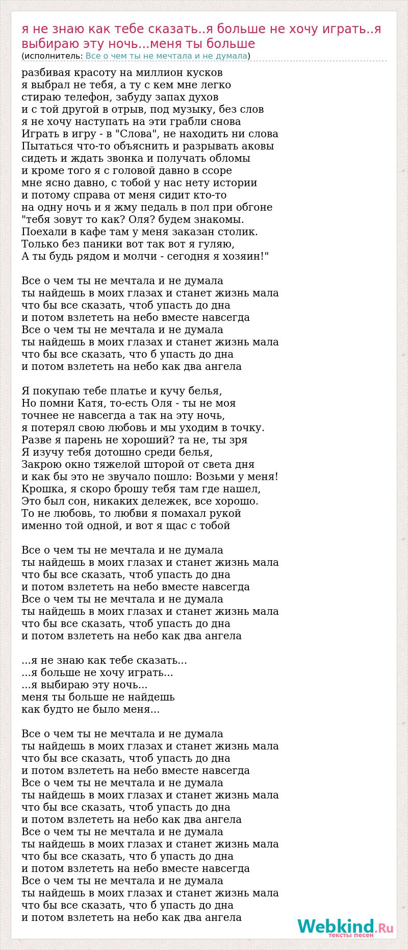 разбивая красоту на миллион кусков я выбрал не тебя, а ту с кем мне легко стираю телефон, забуду запах духов и с той другой в отрыв, под музыку, без слов я не хочу наступать на эти грабли снова Играть в игру - в "Слова", не находить ни слова Пытаться что-то объяснить и разрывать аковы сидеть и ждать звонка и получать обломы и кроме того я с головой давно в ссоре мне ясно давно, с тобой у нас нету истории и потому справа от меня сидит кто-то на одну ночь и я жму педаль в пол при обгоне "тебя зовут то как? Оля? будем знакомы. Поехали в кафе там у меня заказан столик. Только без паники вот так вот я гуляю, А ты будь рядом и молчи - сегодня я хозяин!" Все о чем ты не мечтала и не думала ты найдешь в моих глазах и станет жизнь мала что бы все сказать, чтоб упасть до дна и потом взлететь на небо вместе навсегда Все о чем ты не мечтала и не думала ты найдешь в моих глазах и станет жизнь мала что бы все сказать, что б упасть до дна и потом взлететь на небо как два ангела Я покупаю тебе платье и кучу белья, Но помни Катя, то-есть Оля - ты не моя точнее не навсегда а так на эту ночь, я потерял свою любовь и мы уходим в точку. Разве я парень не хороший? та не, ты зря Я изучу тебя дотошно среди белья, Закрою окно тяжелой шторой от света дня и как бы это не звучало пошло: Возьми у меня! Крошка, я скоро брошу тебя там где нашел, Это был сон, никаких дележек, все хорошо. То не любовь, то любви я помахал рукой именно той одной, и вот я щас с тобой Все о чем ты не мечтала и не думала ты найдешь в моих глазах и станет жизнь мала что бы все сказать, чтоб упасть до дна и потом взлететь на небо вместе навсегда Все о чем ты не мечтала и не думала ты найдешь в моих глазах и станет жизнь мала что бы все сказать, чтоб упасть до дна и потом взлететь на небо как два ангела ...я не знаю как тебе сказать... ...я больше не хочу играть... ...я выбираю эту ночь... меня ты больше не найдешь как будто не было меня... Все о чем ты не мечтала и не думала ты найдешь в моих глазах и станет жизнь мала что бы все сказать, чтоб упасть до дна и потом взлететь на небо вместе навсегда Все о чем ты не мечтала и не думала ты найдешь в моих глазах и станет жизнь мала что бы все сказать, чтоб упасть до дна и потом взлететь на небо как два ангела Все о чем ты не мечтала и не думала ты найдешь в моих глазах и станет жизнь мала что бы все сказать, что б упасть до дна и потом взлететь на небо вместе навсегда Все о чем ты не мечтала и не думала ты найдешь в моих глазах и станет жизнь мала что бы все сказать, что б упасть до дна и потом взлететь на небо как два ангела