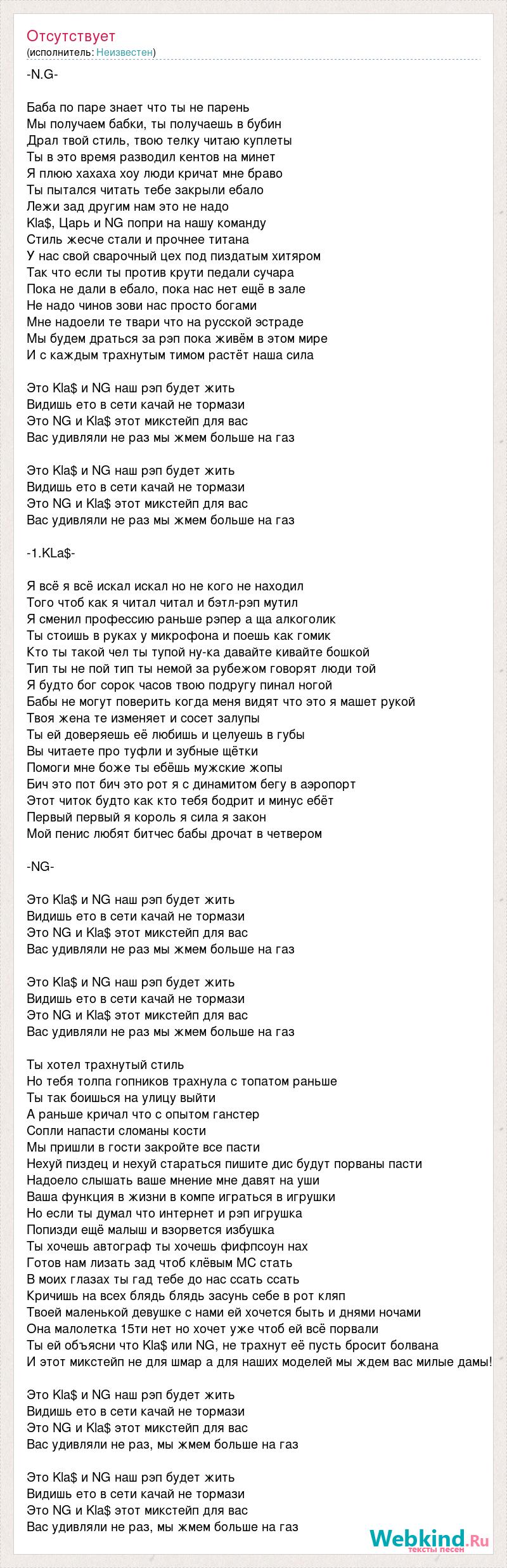 -N.G- Баба по паре знает что ты не парень Мы получаем бабки, ты получаешь в бубин Драл твой стиль, твою телку читаю куплеты Ты в это время разводил кентов на минет Я плюю хахаха хоу люди кричат мне браво Ты пытался читать тебе закрыли ебало Лежи зад другим нам это не надо Kla$, Царь и NG попри на нашу команду Стиль жесче стали и прочнее титана У нас свой сварочный цех под пиздатым хитяром Так что если ты против крути педали сучара Пока не дали в ебало, пока нас нет ещё в зале Не надо чинов зови нас просто богами Мне надоели те твари что на русской эстраде Мы будем драться за рэп пока живём в этом мире И с каждым трахнутым тимом растёт наша сила Это Kla$ и NG наш рэп будет жить Видишь ето в сети качай не тормази Это NG и Kla$ этот микстейп для вас Вас удивляли не раз мы жмем больше на газ Это Kla$ и NG наш рэп будет жить Видишь ето в сети качай не тормази Это NG и Kla$ этот микстейп для вас Вас удивляли не раз мы жмем больше на газ -1.KLa$- Я всё я всё искал искал но не кого не находил Того чтоб как я читал читал и бэтл-рэп мутил Я сменил профессию раньше рэпер а ща алкоголик Ты стоишь в руках у микрофона и поешь как гомик Кто ты такой чел ты тупой ну-ка давайте кивайте бошкой Тип ты не пой тип ты немой за рубежом говорят люди той Я будто бог сорок часов твою подругу пинал ногой Бабы не могут поверить когда меня видят что это я машет рукой Твоя жена те изменяет и сосет залупы Ты ей доверяешь её любишь и целуешь в губы Вы читаете про туфли и зубные щётки Помоги мне боже ты ебёшь мужские жопы Бич это пот бич это рот я с динамитом бегу в аэропорт Этот читок будто как кто тебя бодрит и минус ебёт Первый первый я король я сила я закон Мой пенис любят битчес бабы дрочат в четвером -NG- Это Kla$ и NG наш рэп будет жить Видишь ето в сети качай не тормази Это NG и Kla$ этот микстейп для вас Вас удивляли не раз мы жмем больше на газ Это Kla$ и NG наш рэп будет жить Видишь ето в сети качай не тормази Это NG и Kla$ этот микстейп для вас Вас удивляли не раз мы жмем больше на газ Ты хотел трахнутый стиль Но тебя толпа гопников трахнула с топатом раньше Ты так боишься на улицу выйти А раньше кричал что с опытом ганстер Сопли напасти сломаны кости Мы пришли в гости закройте все пасти Нехуй пиздец и нехуй стараться пишите дис будут порваны пасти Надоело слышать ваше мнение мне давят на уши Ваша функция в жизни в компе играться в игрушки Но если ты думал что интернет и рэп игрушка Попизди ещё малыш и взорвется избушка Ты хочешь автограф ты хочешь фифпсоун нах Готов нам лизать зад чтоб клёвым MC стать В моих глазах ты гад тебе до нас ссать ссать Кричишь на всех блядь блядь засунь себе в рот кляп Твоей маленькой девушке с нами ей хочется быть и днями ночами Она малолетка 15ти нет но хочет уже чтоб ей всё порвали Ты ей объясни что Kla$ или NG, не трахнут её пусть бросит болвана И этот микстейп не для шмар а для наших моделей мы ждем вас милые дамы! Это Kla$ и NG наш рэп будет жить Видишь ето в сети качай не тормази Это NG и Kla$ этот микстейп для вас Вас удивляли не раз, мы жмем больше на газ Это Kla$ и NG наш рэп будет жить Видишь ето в сети качай не тормази Это NG и Kla$ этот микстейп для вас Вас удивляли не раз, мы жмем больше на газ