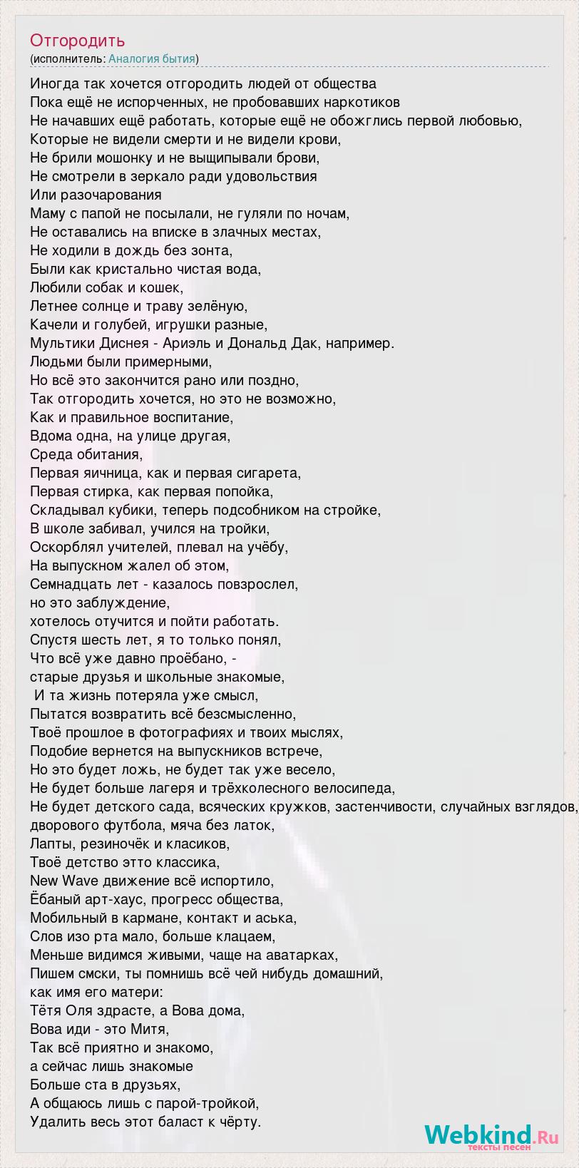 Иногда так хочется отгородить людей от общества Пока ещё не испорченных, не пробовавших наркотиков Не начавших ещё работать, которые ещё не обожглись первой любовью, Которые не видели смерти и не видели крови, Не брили мошонку и не выщипывали брови, Не смотрели в зеркало ради удовольствия Или разочарования Маму с папой не посылали, не гуляли по ночам, Не оставались на вписке в злачных местах, Не ходили в дождь без зонта, Были как кристально чистая вода, Любили собак и кошек, Летнее солнце и траву зелёную, Качели и голубей, игрушки разные, Мультики Диснея - Ариэль и Дональд Дак, например. Людьми были примерными, Но всё это закончится рано или поздно, Так отгородить хочется, но это не возможно, Как и правильное воспитание, Вдома одна, на улице другая, Среда обитания, Первая яичница, как и первая сигарета, Первая стирка, как первая попойка, Складывал кубики, теперь подсобником на стройке, В школе забивал, учился на тройки, Оскорблял учителей, плевал на учёбу, На выпускном жалел об этом, Семнадцать лет - казалось повзрослел, но это заблуждение, хотелось отучится и пойти работать. Спустя шесть лет, я то только понял, Что всё уже давно проёбано, - старые друзья и школьные знакомые, И та жизнь потеряла уже смысл, Пытатся возвратить всё безсмысленно, Твоё прошлое в фотографиях и твоих мыслях, Подобие вернется на выпускников встрече, Но это будет ложь, не будет так уже весело, Не будет больше лагеря и трёхколесного велосипеда, Не будет детского сада, всяческих кружков, застенчивости, случайных взглядов, дворового футбола, мяча без латок, Лапты, резиночёк и класиков, Твоё детство этто классика, New Wave движение всё испортило, Ёбаный арт-хаус, прогресс общества, Мобильный в кармане, контакт и аська, Слов изо рта мало, больше клацаем, Меньше видимся живыми, чаще на аватарках, Пишем смски, ты помнишь всё чей нибудь домашний, как имя его матери: Тётя Оля здрасте, а Вова дома, Вова иди - это Митя, Так всё приятно и знакомо, а сейчас лишь знакомые Больше ста в друзьях, А общаюсь лишь с парой-тройкой, Удалить весь этот баласт к чёрту.