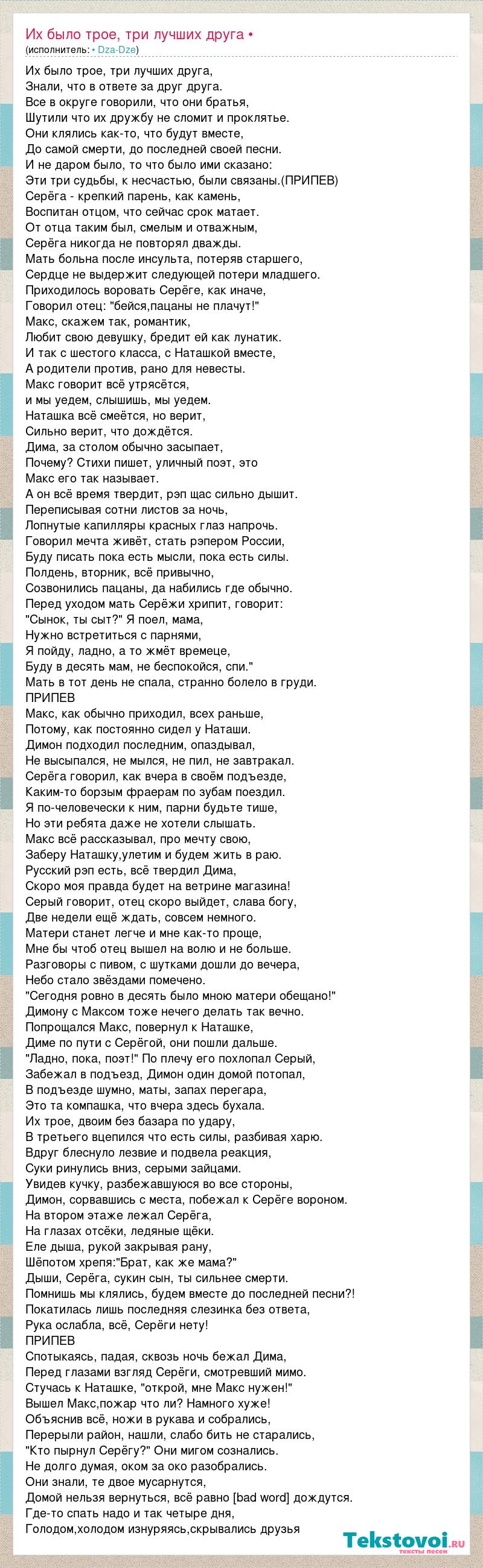 Их было трое, три лучших друга, Знали, что в ответе за друг друга. Все в округе говорили, что они братья, Шутили что их дружбу не сломит и проклятье. Они клялись как-то, что будут вместе, До самой смерти, до последней своей песни. И не даром было, то что было ими сказано: Эти три судьбы, к несчастью, были связаны.(ПРИПЕВ) Серёга - крепкий парень, как камень, Воспитан отцом, что сейчас срок матает. От отца таким был, смелым и отважным, Серёга никогда не повторял дважды. Мать больна после инсульта, потеряв старшего, Сердце не выдержит следующей потери младшего. Приходилось воровать Серёге, как иначе, Говорил отец: "бейся,пацаны не плачут!" Макс, скажем так, романтик, Любит свою девушку, бредит ей как лунатик. И так с шестого класса, с Наташкой вместе, А родители против, рано для невесты. Макс говорит всё утрясётся, и мы уедем, слышишь, мы уедем. Наташка всё смеётся, но верит, Сильно верит, что дождётся. Дима, за столом обычно засыпает, Почему? Стихи пишет, уличный поэт, это Макс его так называет. А он всё время твердит, рэп щас сильно дышит. Переписывая сотни листов за ночь, Лопнутые капилляры красных глаз напрочь. Говорил мечта живёт, стать рэпером России, Буду писать пока есть мысли, пока есть силы. Полдень, вторник, всё привычно, Созвонились пацаны, да набились где обычно. Перед уходом мать Серёжи хрипит, говорит: "Сынок, ты сыт?" Я поел, мама, Нужно встретиться с парнями, Я пойду, ладно, а то жмёт времеце, Буду в десять мам, не беспокойся, спи." Мать в тот день не спала, странно болело в груди. ПРИПЕВ Макс, как обычно приходил, всех раньше, Потому, как постоянно сидел у Наташи. Димон подходил последним, опаздывал, Не высыпался, не мылся, не пил, не завтракал. Серёга говорил, как вчера в своём подъезде, Каким-то борзым фраерам по зубам поездил. Я по-человечески к ним, парни будьте тише, Но эти ребята даже не хотели слышать. Макс всё рассказывал, про мечту свою, Заберу Наташку,улетим и будем жить в раю. Русский рэп есть, всё твердил Дима, Скоро моя правда будет на ветрине магазина! Серый говорит, отец скоро выйдет, слава богу, Две недели ещё ждать, совсем немного. Матери станет легче и мне как-то проще, Мне бы чтоб отец вышел на волю и не больше. Разговоры с пивом, с шутками дошли до вечера, Небо стало звёздами помечено. "Сегодня ровно в десять было мною матери обещано!" Димону с Максом тоже нечего делать так вечно. Попрощался Макс, повернул к Наташке, Диме по пути с Серёгой, они пошли дальше. "Ладно, пока, поэт!" По плечу его похлопал Серый, Забежал в подъезд, Димон один домой потопал, В подъезде шумно, маты, запах перегара, Это та компашка, что вчера здесь бухала. Их трое, двоим без базара по удару, В третьего вцепился что есть силы, разбивая харю. Вдруг блеснуло лезвие и подвела реакция, Суки ринулись вниз, серыми зайцами. Увидев кучку, разбежавшуюся во все стороны, Димон, сорвавшись с места, побежал к Серёге вороном. На втором этаже лежал Серёга, На глазах отсёки, ледяные щёки. Еле дыша, рукой закрывая рану, Шёпотом хрепя:"Брат, как же мама?" Дыши, Серёга, сукин сын, ты сильнее смерти. Помнишь мы клялись, будем вместе до последней песни?! Покатилась лишь последняя слезинка без ответа, Рука ослабла, всё, Серёги нету! ПРИПЕВ Спотыкаясь, падая, сквозь ночь бежал Дима, Перед глазами взгляд Серёги, смотревший мимо. Стучась к Наташке, "открой, мне Макс нужен!" Вышел Макс,пожар что ли? Намного хуже! Объясн