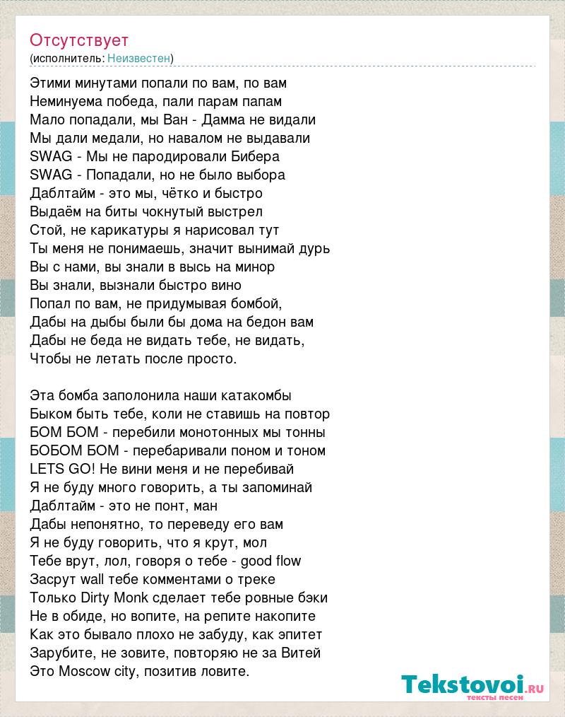 Этими минутами попали по вам, по вам Неминуема победа, пали парам папам Мало попадали, мы Ван - Дамма не видали Мы дали медали, но навалом не выдавали SWAG - Мы не пародировали Бибера SWAG - Попадали, но не было выбора Даблтайм - это мы, чётко и быстро Выдаём на биты чокнутый выстрел Стой, не карикатуры я нарисовал тут Ты меня не понимаешь, значит вынимай дурь Вы с нами, вы знали в высь на минор Вы знали, вызнали быстро вино Попал по вам, не придумывая бомбой, Дабы на дыбы были бы дома на бедон вам Дабы не беда не видать тебе, не видать, Чтобы не летать после просто. Эта бомба заполонила наши катакомбы Быком быть тебе, коли не ставишь на повтор БОМ БОМ - перебили монотонных мы тонны БОБОМ БОМ - перебаривали поном и тоном LETS GO! Не вини меня и не перебивай Я не буду много говорить, а ты запоминай Даблтайм - это не понт, ман Дабы непонятно, то переведу его вам Я не буду говорить, что я крут, мол Тебе врут, лол, говоря о тебе - good flow Засрут wall тебе комментами о треке Только Dirty Monk сделает тебе ровные бэки Не в обиде, но вопите, на репите накопите Как это бывало плохо не забуду, как эпитет Зарубите, не зовите, повторяю не за Витей Это Moscow city, позитив ловите.
