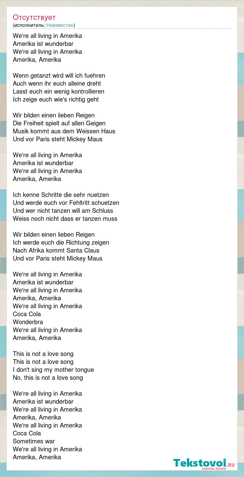 We're all living in Amerika Amerika ist wunderbar We're all living in Amerika Amerika, Amerika Wenn getanzt wird will ich fuehren Auch wenn ihr euch alleine dreht Lasst euch ein wenig kontrollieren Ich zeige euch wie's richtig geht Wir bilden einen lieben Reigen Die Freiheit spielt auf allen Geigen Musik kommt aus dem Weissen Haus Und vor Paris steht Mickey Maus We're all living in Amerika Amerika ist wunderbar We're all living in Amerika Amerika, Amerika Ich kenne Schritte die sehr nuetzen Und werde euch vor Fehltritt schuetzen Und wer nicht tanzen will am Schluss Weiss noch nicht dass er tanzen muss Wir bilden einen lieben Reigen Ich werde euch die Richtung zeigen Nach Afrika kommt Santa Claus Und vor Paris steht Mickey Maus We're all living in Amerika Amerika ist wunderbar We're all living in Amerika Amerika, Amerika We're all living in Amerika Coca Cola Wonderbra We're all living in Amerika Amerika, Amerika This is not a love song This is not a love song I don't sing my mother tongue No, this is not a love song We're all living in Amerika Amerika ist wunderbar We're all living in Amerika Amerika, Amerika We're all living in Amerika Coca Cola Sometimes war We're all living in Amerika Amerika, Amerika