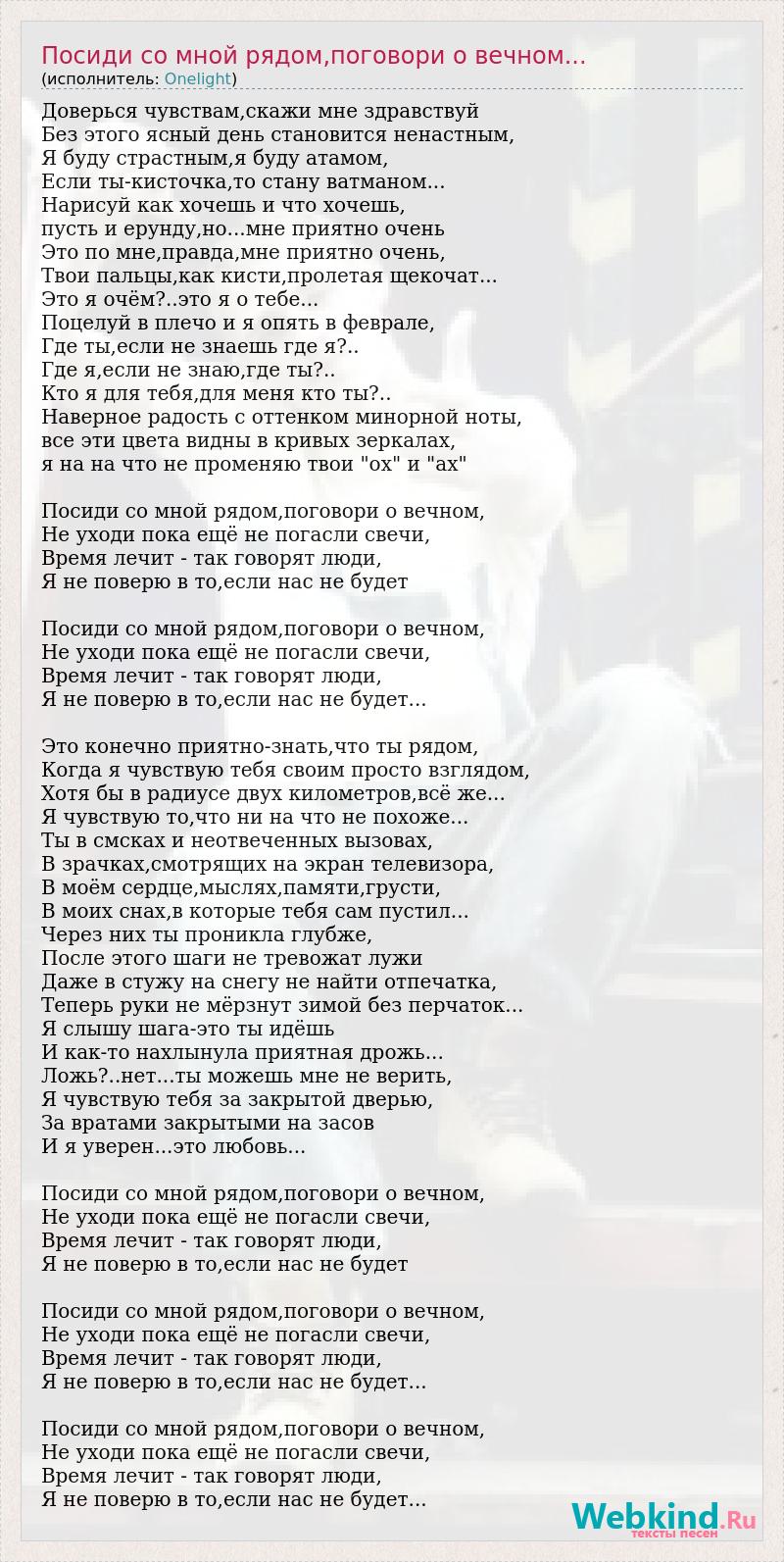 Доверься чувствам,скажи мне здравствуй Без этого ясный день становится ненастным, Я буду страстным,я буду атамом, Если ты-кисточка,то стану ватманом... Нарисуй как хочешь и что хочешь, пусть и ерунду,но...мне приятно очень Это по мне,правда,мне приятно очень, Твои пальцы,как кисти,пролетая щекочат... Это я очём?..это я о тебе... Поцелуй в плечо и я опять в феврале, Где ты,если не знаешь где я?.. Где я,если не знаю,где ты?.. Кто я для тебя,для меня кто ты?.. Наверное радость с оттенком минорной ноты, все эти цвета видны в кривых зеркалах, я на на что не променяю твои "ох" и "ах" Посиди со мной рядом,поговори о вечном, Не уходи пока ещё не погасли свечи, Время лечит - так говорят люди, Я не поверю в то,если нас не будет Посиди со мной рядом,поговори о вечном, Не уходи пока ещё не погасли свечи, Время лечит - так говорят люди, Я не поверю в то,если нас не будет... Это конечно приятно-знать,что ты рядом, Когда я чувствую тебя своим просто взглядом, Хотя бы в радиусе двух километров,всё же... Я чувствую то,что ни на что не похоже... Ты в смсках и неотвеченных вызовах, В зрачках,смотрящих на экран телевизора, В моём сердце,мыслях,памяти,грусти, В моих снах,в которые тебя сам пустил... Через них ты проникла глубже, После этого шаги не тревожат лужи Даже в стужу на снегу не найти отпечатка, Теперь руки не мёрзнут зимой без перчаток... Я слышу шага-это ты идёшь И как-то нахлынула приятная дрожь... Ложь?..нет...ты можешь мне не верить, Я чувствую тебя за закрытой дверью, За вратами закрытыми на засов И я уверен...это любовь... Посиди со мной рядом,поговори о вечном, Не уходи пока ещё не погасли свечи, Время лечит - так говорят люди, Я не поверю в то,если нас не будет Посиди со мной рядом,поговори о вечном, Не уходи пока ещё не погасли свечи, Время лечит - так говорят люди, Я не поверю в то,если нас не будет... Посиди со мной рядом,поговори о вечном, Не уходи пока ещё не погасли свечи, Время лечит - так говорят люди, Я не поверю в то,если нас не будет...