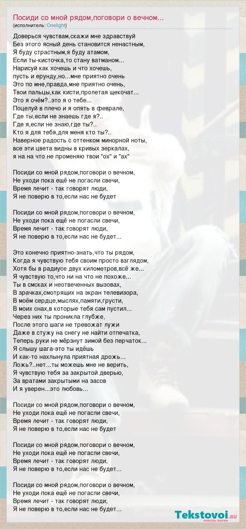 Доверься чувствам,скажи мне здравствуй Без этого ясный день становится ненастным, Я буду страстным,я буду атамом, Если ты-кисточка,то стану ватманом... Нарисуй как хочешь и что хочешь, пусть и ерунду,но...мне приятно очень Это по мне,правда,мне приятно очень, Твои пальцы,как кисти,пролетая щекочат... Это я очём?..это я о тебе... Поцелуй в плечо и я опять в феврале, Где ты,если не знаешь где я?.. Где я,если не знаю,где ты?.. Кто я для тебя,для меня кто ты?.. Наверное радость с оттенком минорной ноты, все эти цвета видны в кривых зеркалах, я на на что не променяю твои "ох" и "ах" Посиди со мной рядом,поговори о вечном, Не уходи пока ещё не погасли свечи, Время лечит - так говорят люди, Я не поверю в то,если нас не будет Посиди со мной рядом,поговори о вечном, Не уходи пока ещё не погасли свечи, Время лечит - так говорят люди, Я не поверю в то,если нас не будет... Это конечно приятно-знать,что ты рядом, Когда я чувствую тебя своим просто взглядом, Хотя бы в радиусе двух километров,всё же... Я чувствую то,что ни на что не похоже... Ты в смсках и неотвеченных вызовах, В зрачках,смотрящих на экран телевизора, В моём сердце,мыслях,памяти,грусти, В моих снах,в которые тебя сам пустил... Через них ты проникла глубже, После этого шаги не тревожат лужи Даже в стужу на снегу не найти отпечатка, Теперь руки не мёрзнут зимой без перчаток... Я слышу шага-это ты идёшь И как-то нахлынула приятная дрожь... Ложь?..нет...ты можешь мне не верить, Я чувствую тебя за закрытой дверью, За вратами закрытыми на засов И я уверен...это любовь... Посиди со мной рядом,поговори о вечном, Не уходи пока ещё не погасли свечи, Время лечит - так говорят люди, Я не поверю в то,если нас не будет Посиди со мной рядом,поговори о вечном, Не уходи пока ещё не погасли свечи, Время лечит - так говорят люди, Я не поверю в то,если нас не будет... Посиди со мной рядом,поговори о вечном, Не уходи пока ещё не погасли свечи, Время лечит - так говорят люди, Я не поверю в то,если нас не будет...