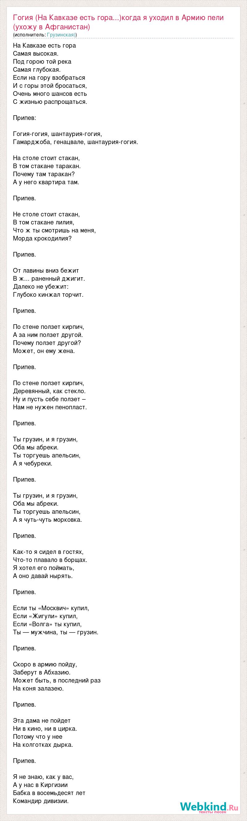 На Кавказе есть гора Самая высокая. Под горою той река Самая глубокая. Если на гору взобраться И с горы этой бросаться, Очень много шансов есть С жизнью распрощаться. Припев: Гогия-гогия, шантаурия-гогия, Гамарджоба, генацвале, шантаурия-гогия. На столе стоит стакан, В том стакане таракан. Почему там таракан? А у него квартира там. Припев. Не столе стоит стакан, В том стакане лилия, Что ж ты смотришь на меня, Морда крокодилия? Припев. От лавины вниз бежит В ж... раненный джигит. Далеко не убежит: Глубоко кинжал торчит. Припев. По стене ползет кирпич, А за ним ползет другой. Почему ползет другой? Может, он ему жена. Припев. По стене ползет кирпич, Деревянный, как стекло. Ну и пусть себе ползет – Нам не нужен пенопласт. Припев. Ты грузин, и я грузин, Оба мы абреки. Ты торгуешь апельсин, А я чебуреки. Припев. Ты грузин, и я грузин, Оба мы абреки. Ты торгуешь апельсин, А я чуть-чуть морковка. Припев. Как-то я сидел в гостях, Что-то плавало в борщах. Я хотел его поймать, А оно давай нырять. Припев. Если ты «Москвич» купил, Если «Жигули» купил, Если «Волга» ты купил, Ты — мужчина, ты — грузин. Припев. Скоро в армию пойду, Заберут в Абхазию. Может быть, в последний раз На коня залазею. Припев. Эта дама не пойдет Ни в кино, ни в цирка. Потому что у нее На колготках дырка. Припев. Я не знаю, как у вас, А у нас в Киргизии Бабка в восемьдесят лет Командир дивизии.