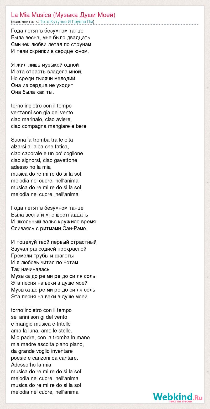 Года летят в безумном танце Была весна, мне было двадцать Смычек любви летал по струнам И пели скрипки в сердце юном. Я жил лишь музыкой одной И эта страсть владела мной, Но среди тысячи мелодий Она из сердца не уходит Она была как ты. torno indietro con il tempo vent'anni son gia del vento ciao marinaio, ciao aviere, ciao compagna mangiare e bere Suona la tromba tra le dita alzarsi all'alba che fatica, ciao caporale e un po' coglione ciao signorsi, ciao gavettone adesso ho la mia musica do re mi re do si la sol melodia nel cuore, nell'anima musica do re mi re do si la sol melodia nel cuore, nell'anima Года летят в безумном танце Была весна и мне шестнадцать И школьный вальс кружило время Сливаясь с ритмами Сан-Рэмо. И поцелуй твой первый страстный Звучал рапсодией прекрасной Гремели трубы и фаготы И я любовь читал по нотам Так начиналась Музыка до ре ми ре до си ля соль Эта песня на веки в душе моей Музыка до ре ми ре до си ля соль Эта песня на веки в душе моей torno indietro con il tempo sei anni son gi del vento e mangio musica e fritelle amo la luna, amo le stelle. Mio padre, con la tromba in mano mia madre ascolta piano piano, da grande voglio inventare poesie e canzoni da cantare. Adesso ho la mia musica do re mi re do si la sol melodia nel cuore, nell'anima musica do re mi re do si la sol melodia nel cuore, nell'anima