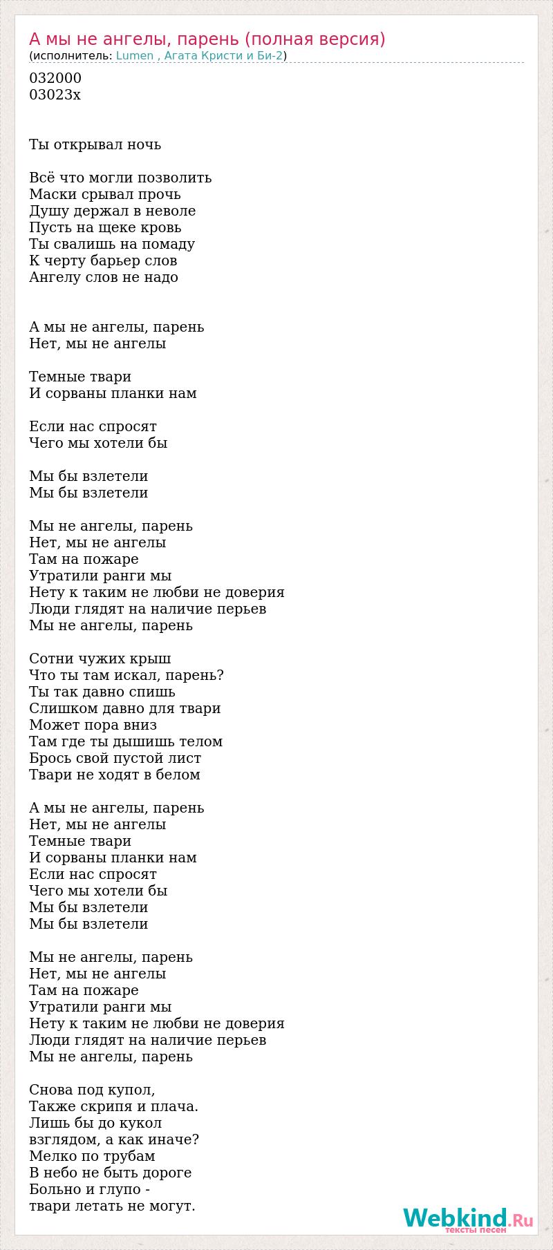 032000 03023x Ты открывал ночь Всё что могли позволить Маски срывал прочь Душу держал в неволе Пусть на щеке кровь Ты свалишь на помаду К черту барьер слов Ангелу слов не надо А мы не ангелы, парень Нет, мы не ангелы Темные твари И сорваны планки нам Если нас спросят Чего мы хотели бы Мы бы взлетели Мы бы взлетели Мы не ангелы, парень Нет, мы не ангелы Там на пожаре Утратили ранги мы Нету к таким не любви не доверия Люди глядят на наличие перьев Мы не ангелы, парень Сотни чужих крыш Что ты там искал, парень? Ты так давно спишь Слишком давно для твари Может пора вниз Там где ты дышишь телом Брось свой пустой лист Твари не ходят в белом А мы не ангелы, парень Нет, мы не ангелы Темные твари И сорваны планки нам Если нас спросят Чего мы хотели бы Мы бы взлетели Мы бы взлетели Мы не ангелы, парень Нет, мы не ангелы Там на пожаре Утратили ранги мы Нету к таким не любви не доверия Люди глядят на наличие перьев Мы не ангелы, парень Снова под купол, Также скрипя и плача. Лишь бы до кукол взглядом, а как иначе? Мелко по трубам В небо не быть дороге Больно и глупо - твари летать не могут.