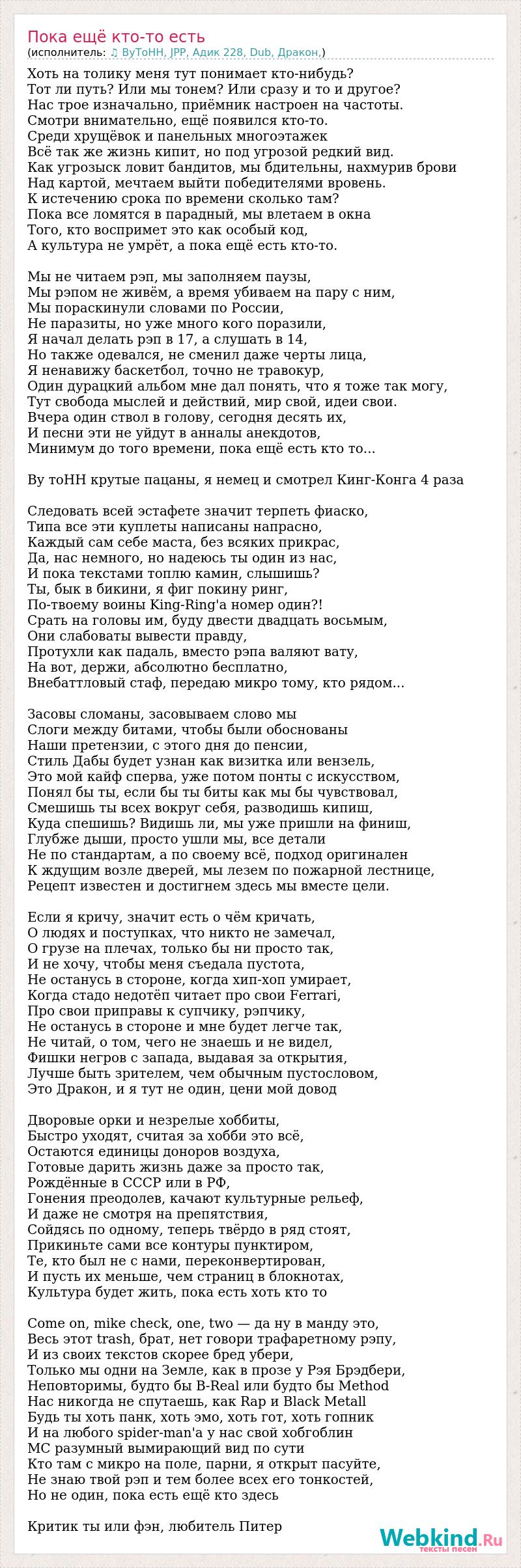 Хоть на толику меня тут понимает кто-нибудь? Тот ли путь? Или мы тонем? Или сразу и то и другое? Нас трое изначально, приёмник настроен на частоты. Смотри внимательно, ещё появился кто-то. Среди хрущёвок и панельных многоэтажек Всё так же жизнь кипит, но под угрозой редкий вид. Как угрозыск ловит бандитов, мы бдительны, нахмурив брови Над картой, мечтаем выйти победителями вровень. К истечению срока по времени сколько там? Пока все ломятся в парадный, мы влетаем в окна Того, кто воспримет это как особый код, А культура не умрёт, а пока ещё есть кто-то. Мы не читаем рэп, мы заполняем паузы, Мы рэпом не живём, а время убиваем на пару с ним, Мы пораскинули словами по России, Не паразиты, но уже много кого поразили, Я начал делать рэп в 17, а слушать в 14, Но также одевался, не сменил даже черты лица, Я ненавижу баскетбол, точно не травокур, Один дурацкий альбом мне дал понять, что я тоже так могу, Тут свобода мыслей и действий, мир свой, идеи свои. Вчера один ствол в голову, сегодня десять их, И песни эти не уйдут в анналы анекдотов, Минимум до того времени, пока ещё есть кто то... Ву тоНН крутые пацаны, я немец и смотрел Кинг-Конга 4 раза Следовать всей эстафете значит терпеть фиаско, Типа все эти куплеты написаны напрасно, Каждый сам себе маста, без всяких прикрас, Да, нас немного, но надеюсь ты один из нас, И пока текстами топлю камин, слышишь? Ты, бык в бикини, я фиг покину ринг, По-твоему воины King-Ring'а номер один?! Срать на головы им, буду двести двадцать восьмым, Они слабоваты вывести правду, Протухли как падаль, вместо рэпа валяют вату, На вот, держи, абсолютно бесплатно, Внебаттловый стаф, передаю микро тому, кто рядом... Засовы сломаны, засовываем слово мы Слоги между битами, чтобы были обоснованы Наши претензии, с этого дня до пенсии, Стиль Дабы будет узнан как визитка или вензель, Это мой кайф сперва, уже потом понты с искусством, Понял бы ты, если бы ты биты как мы бы чувствовал, Смешишь ты всех вокруг себя, разводишь кипиш, Куда спешишь? Видишь ли, мы уже пришли на финиш, Глубже дыши, просто ушли мы, все детали Не по стандартам, а по своему всё, подход оригинален К ждущим возле дверей, мы лезем по пожарной лестнице, Рецепт известен и достигнем здесь мы вместе цели. Если я кричу, значит есть о чём кричать, О людях и поступках, что никто не замечал, О грузе на плечах, только бы ни просто так, И не хочу, чтобы меня съедала пустота, Не останусь в стороне, когда хип-хоп умирает, Когда стадо недотёп читает про свои Ferrari, Про свои приправы к супчику, рэпчику, Не останусь в стороне и мне будет легче так, Не читай, о том, чего не знаешь и не видел, Фишки негров с запада, выдавая за открытия, Лучше быть зрителем, чем обычным пустословом, Это Дракон, и я тут не один, цени мой довод Дворовые орки и незрелые хоббиты, Быстро уходят, считая за хобби это всё, Остаются единицы доноров воздуха, Готовые дарить жизнь даже за просто так, Рождённые в СССР или в РФ, Гонения преодолев, качают культурные рельеф, И даже не смотря на препятствия, Сойдясь по одному, теперь твёрдо в ряд стоят, Прикиньте сами все контуры пунктиром, Те, кто был не с нами, переконвертирован, И пусть их меньше, чем страниц в блокнотах, Культура будет жить, пока есть хоть кто то Come on, mike check, one, two — да ну в манду это, Весь этот trash, брат, нет говори трафаретному рэпу, И из своих текстов скорее бред убери, Только мы одни на Земле, как в прозе у Рэя 