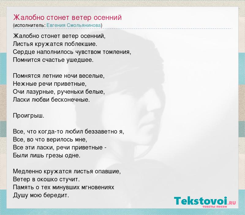 Жалобно стонет ветер осенний, Листья кружатся поблекшие. Сердце наполнилось чувством томления, Помнится счастье ушедшее. Помнятся летние ночи веселые, Нежные речи приветные, Очи лазурные, рученьки белые, Ласки любви бесконечные. Проигрыш. Все, что когда-то любил беззаветно я, Все, во что верилось мне, Все эти ласки, речи приветные - Были лишь грезы одне. Медленно кружатся листья опавшие, Ветер в окошко стучит. Память о тех минувших мгновениях Душу мою бередит.