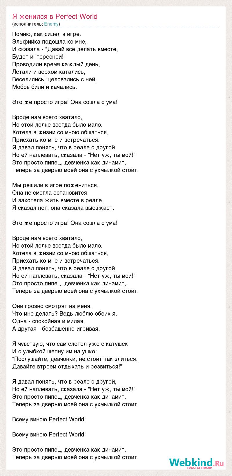 Помню, как сидел в игре. Эльфийка подошла ко мне, И сказала - "Давай всё делать вместе, Будет интересней!" Проводили время каждый день, Летали и верхом катались, Веселились, целовались с ней, Мобов били и качались. Это же просто игра! Она сошла с ума! Вроде нам всего хватало, Но этой лолке всегда было мало. Хотела в жизни со мною общаться, Приехать ко мне и встречаться. Я давал понять, что в реале с другой, Но ей наплевать, сказала - "Нет уж, ты мой!" Это просто пипец, девченка как динамит, Теперь за дверью моей она с ухмылкой стоит. Мы решили в игре пожениться, Она не смогла остановится И захотела жить вместе в реале, Я сказал нет, она сказала выезжает. Это же просто игра! Она сошла с ума! Вроде нам всего хватало, Но этой лолке всегда было мало. Хотела в жизни со мною общаться, Приехать ко мне и встречаться. Я давал понять, что в реале с другой, Но ей наплевать, сказала - "Нет уж, ты мой!" Это просто пипец, девченка как динамит, Теперь за дверью моей она с ухмылкой стоит. Они грозно смотрят на меня, Что мне делать? Ведь люблю обеих я. Одна - спокойная и милая, А другая - безбашенно-игривая. Я чувствую, что сам слетел уже с катушек И с улыбкой шепну им на ушко: "Послушайте, девчонки, не стоит так злиться. Давайте втроем отдыхать и резвиться!" Я давал понять, что в реале с другой, Но ей наплевать, сказала - "Нет уж, ты мой!" Это просто пипец, девченка как динамит, Теперь за дверью моей она с ухмылкой стоит. Всему виною Perfect World! Всему виною Perfect World! Это просто пипец, девченка как динамит, Теперь за дверью моей она с ухмылкой стоит.