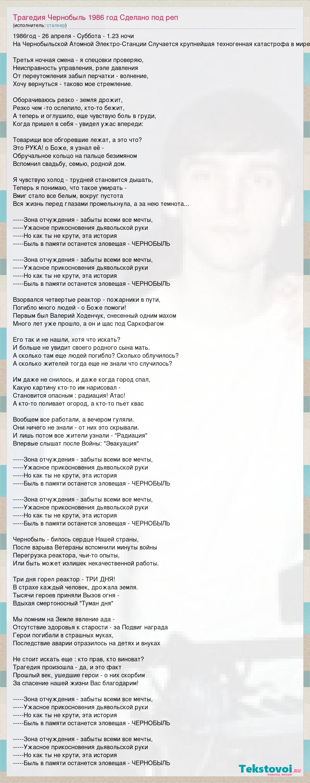 1986год - 26 апреля - Суббота - 1.23 ночи На Чернобыльской Атомной Электро-Станции Случается крупнейшая техногенная катастрофа в мире Третья ночная смена - я спецовки проверяю, Неисправность управления, рэле давления От переутомления забыл перчатки - волнение, Хочу вернуться - таково мое стремление. Оборачиваюсь резко - земля дрожит, Резко чем -то ослепило, кто-то бежит, А теперь и оглушило, еще чувствую боль в груди, Когда пришел в себя - увидел ужас впереди: Товарищи все обгоревшие лежат, а это что? Это РУКА! о Боже, я узнал её - Обручальное кольцо на пальце безимяном Вспомнил свадьбу, семью, родной дом. Я чувствую холод - трудней становится дышать, Теперь я понимаю, что такое умирать - Вмиг стало все белым, вокруг пустота Вся жизнь перед глазами промелькнула, а за нею темнота... -----Зона отчуждения - забыты всеми все мечты, -----Ужасное прикосновения дьявольской руки -----Но как ты не крути, эта история -----Быль в памяти останется зловещая - ЧЕРНОБЫЛЬ -----Зона отчуждения - забыты всеми все мечты, -----Ужасное прикосновения дьявольской руки -----Но как ты не крути, эта история -----Быль в памяти останется зловещая - ЧЕРНОБЫЛЬ Взорвался четвертые реактор - пожарники в пути, Погибло много людей - о Боже помоги! Первым был Валерий Ходенчук, снесенный одним махом Много лет уже прошло, а он и щас под Саркофагом Его так и не нашли, хотя что искать? И больше не увидит своего родного сына мать. А сколько там еще людей погибло? Сколько облучилось? А сколько жителей тогда еще не знали что случилось? Им даже не снилось, и даже когда город спал, Какую картину кто-то им нарисовал - Становится опасным : радиация! Атас! А кто-то поливает огород, а кто-то пьет квас Вообщем все работали, а вечером гуляли. Они ничего не знали - от них это скрывали. И лишь потом все жители узнали - "Радиация" Впервые слышат после Войны: "Эвакуация" -----Зона отчуждения - забыты всеми все мечты, -----Ужасное прикосновения дьявольской руки -----Но как ты не крути, эта история -----Быль в памяти останется зловещая - ЧЕРНОБЫЛЬ -----Зона отчуждения - забыты всеми все мечты, -----Ужасное прикосновения дьявольской руки -----Но как ты не крути, эта история -----Быль в памяти останется зловещая - ЧЕРНОБЫЛЬ Чернобыль - билось сердце Нашей страны, После взрыва Ветераны вспомнили минуты войны Перегрузка реактора, чьи-то опыты, Или быть может излишек некачественной работы. Три дня горел реактор - ТРИ ДНЯ! В страхе каждый человек, дрожала земля. Тысячи героев приняли Вызов огня - Вдыхая смертоносный "Туман дня" Мы помним на Земле явление ада - Отсутствие здоровья к старости - за Подвиг награда Герои погибали в страшных муках, Последствие аварии отразилось на детях и внуках Не стоит искать еще : кто прав, кто виноват? Трагедия произошла - да, и это факт Прошлый век, ушедшие герои - о них скорбим За спасение нашей жизни Вас благодарим! -----Зона отчуждения - забыты всеми все мечты, -----Ужасное прикосновения дьявольской руки -----Но как ты не крути, эта история -----Быль в памяти останется зловещая - ЧЕРНОБЫЛЬ -----Зона отчуждения - забыты всеми все мечты, -----Ужасное прикосновения дьявольской руки -----Но как ты не крути, эта история -----Быль в памяти останется зловещая - ЧЕРНОБЫЛЬ