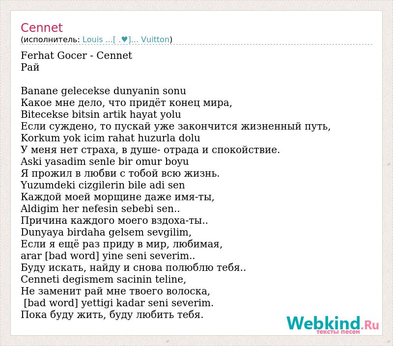 Ferhat Gocer - Cennet Рай Banane gelecekse dunyanin sonu Какое мне дело, что придёт конец мира, Bitecekse bitsin artik hayat yolu Если суждено, то пускай уже закончится жизненный путь, Korkum yok icim rahat huzurla dolu У меня нет страха, в душе- отрада и спокойствие. Aski yasadim senle bir omur boyu Я прожил в любви с тобой всю жизнь. Yuzumdeki cizgilerin bile adi sen Каждой моей морщине даже имя-ты, Aldigim her nefesin sebebi sen.. Причина каждого моего вздоха-ты.. Dunyaya birdaha gelsem sevgilim, Если я ещё раз приду в мир, любимая, arar [bad word] yine seni severim.. Буду искать, найду и снова полюблю тебя.. Cenneti degismem sacinin teline, Не заменит рай мне твоего волоска, [bad word] yettigi kadar seni severim. Пока буду жить, буду любить тебя.