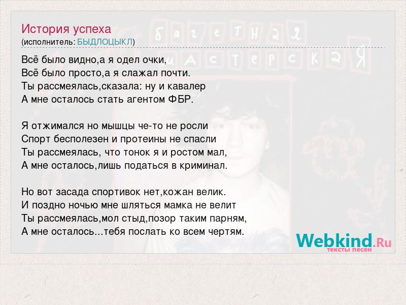 Всё было видно,а я одел очки, Всё было просто,а я слажал почти. Ты рассмеялась,сказала: ну и кавалер А мне осталось стать агентом ФБР. Я отжимался но мышцы че-то не росли Спорт бесполезен и протеины не спасли Ты рассмеялась, что тонок я и ростом мал, А мне осталось,лишь податься в криминал. Но вот засада спортивок нет,кожан велик. И поздно ночью мне шляться мамка не велит Ты рассмеялась,мол стыд,позор таким парням, А мне осталось...тебя послать ко всем чертям.