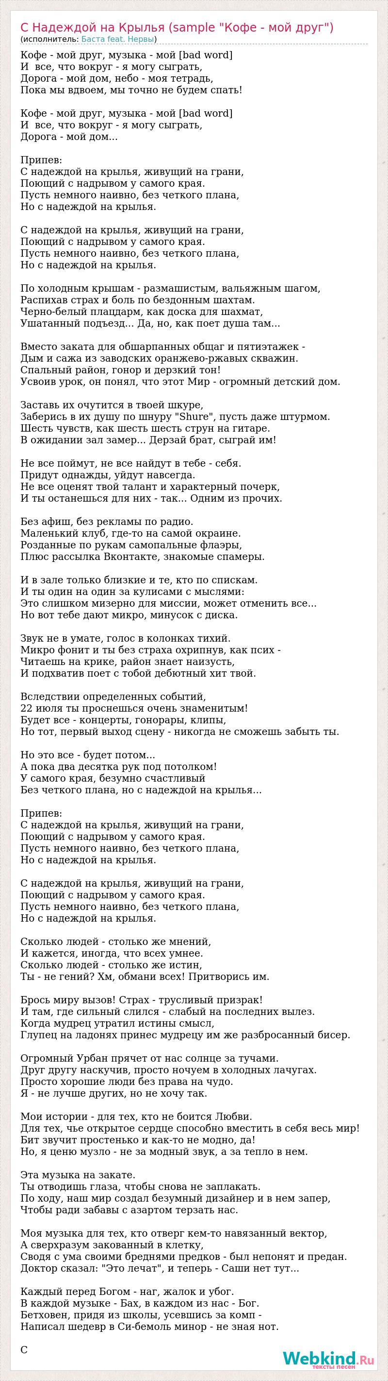 Кофе - мой друг, музыка - мой [bad word] И все, что вокруг - я могу сыграть, Дорога - мой дом, небо - моя тетрадь, Пока мы вдвоем, мы точно не будем спать! Кофе - мой друг, музыка - мой [bad word] И все, что вокруг - я могу сыграть, Дорога - мой дом... Припев: С надеждой на крылья, живущий на грани, Поющий с надрывом у самого края. Пусть немного наивно, без четкого плана, Но с надеждой на крылья. С надеждой на крылья, живущий на грани, Поющий с надрывом у самого края. Пусть немного наивно, без четкого плана, Но с надеждой на крылья. По холодным крышам - размашистым, вальяжным шагом, Распихав страх и боль по бездонным шахтам. Черно-белый плацдарм, как доска для шахмат, Ушатанный подъезд... Да, но, как поет душа там... Вместо заката для обшарпанных общаг и пятиэтажек - Дым и сажа из заводских оранжево-ржавых скважин. Спальный район, гонор и дерзкий тон! Усвоив урок, он понял, что этот Мир - огромный детский дом. Заставь их очутится в твоей шкуре, Заберись в их душу по шнуру "Shure", пусть даже штурмом. Шесть чувств, как шесть шесть струн на гитаре. В ожидании зал замер... Дерзай брат, сыграй им! Не все поймут, не все найдут в тебе - себя. Придут однажды, уйдут навсегда. Не все оценят твой талант и характерный почерк, И ты останешься для них - так... Одним из прочих. Без афиш, без рекламы по радио. Маленький клуб, где-то на самой окраине. Розданные по рукам самопальные флаэры, Плюс рассылка Вконтакте, знакомые спамеры. И в зале только близкие и те, кто по спискам. И ты один на один за кулисами с мыслями: Это слишком мизерно для миссии, может отменить все... Но вот тебе дают микро, минусок с диска. Звук не в умате, голос в колонках тихий. Микро фонит и ты без страха охрипнув, как псих - Читаешь на крике, район знает наизусть, И подхватив поет с тобой дебютный хит твой. Вследствии определенных событий, 22 июля ты проснешься очень знаменитым! Будет все - концерты, гонорары, клипы, Но тот, первый выход сцену - никогда не сможешь забыть ты. Но это все - будет потом... А пока два десятка рук под потолком! У самого края, безумно счастливый Без четкого плана, но с надеждой на крылья... Припев: С надеждой на крылья, живущий на грани, Поющий с надрывом у самого края. Пусть немного наивно, без четкого плана, Но с надеждой на крылья. С надеждой на крылья, живущий на грани, Поющий с надрывом у самого края. Пусть немного наивно, без четкого плана, Но с надеждой на крылья. Сколько людей - столько же мнений, И кажется, иногда, что всех умнее. Сколько людей - столько же истин, Ты - не гений? Хм, обмани всех! Притворись им. Брось миру вызов! Страх - трусливый призрак! И там, где сильный слился - слабый на последних вылез. Когда мудрец утратил истины смысл, Глупец на ладонях принес мудрецу им же разбросанный бисер. Огромный Урбан прячет от нас солнце за тучами. Друг другу наскучив, просто ночуем в холодных лачугах. Просто хорошие люди без права на чудо. Я - не лучше других, но не хочу так. Мои истории - для тех, кто не боится Любви. Для тех, чье открытое сердце способно вместить в себя весь мир! Бит звучит простенько и как-то не модно, да! Но, я ценю музло - не за модный звук, а за тепло в нем. Эта музыка на закате. Ты отводишь глаза, чтобы снова не заплакать. По ходу, наш мир создал безумный дизайнер и в нем запер, Чтобы ради забавы с азартом терзать нас. Моя музыка для тех, кто отверг кем-то навязанный вектор, А сверхразум закованный в клетку, Сводя с ума своим