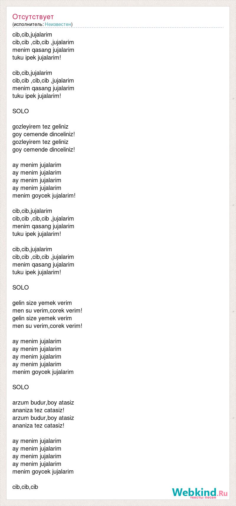 cib,cib,jujalarim cib,cib ,cib,cib ,jujalarim menim qasang jujalarim tuku ipek jujalarim! cib,cib,jujalarim cib,cib ,cib,cib ,jujalarim menim qasang jujalarim tuku ipek jujalarim! SOLO gozleyirem tez geliniz goy cemende dinceliniz! gozleyirem tez geliniz goy cemende dinceliniz! ay menim jujalarim ay menim jujalarim ay menim jujalarim ay menim jujalarim menim goycek jujalarim! cib,cib,jujalarim cib,cib ,cib,cib ,jujalarim menim qasang jujalarim tuku ipek jujalarim! cib,cib,jujalarim cib,cib ,cib,cib ,jujalarim menim qasang jujalarim tuku ipek jujalarim! SOLO gelin size yemek verim men su verim,corek verim! gelin size yemek verim men su verim,corek verim! ay menim jujalarim ay menim jujalarim ay menim jujalarim ay menim jujalarim menim goycek jujalarim SOLO arzum budur,boy atasiz ananiza tez catasiz! arzum budur,boy atasiz ananiza tez catasiz! ay menim jujalarim ay menim jujalarim ay menim jujalarim ay menim jujalarim menim goycek jujalarim cib,cib,cib