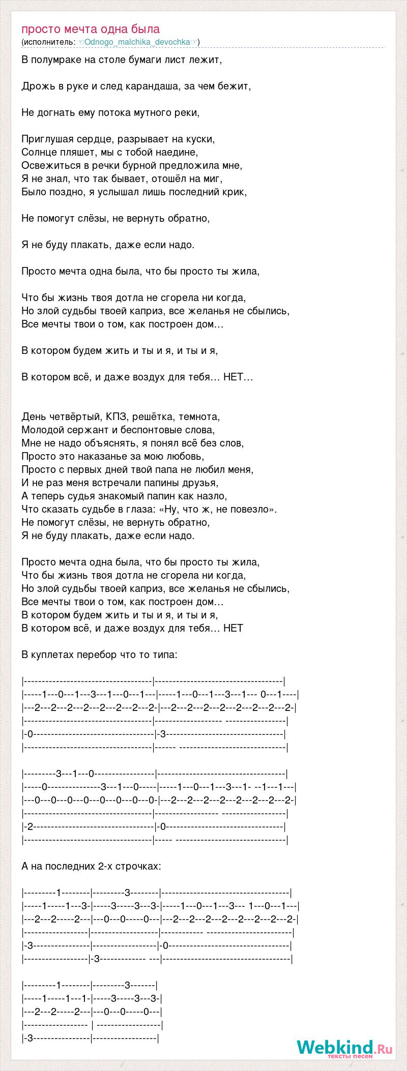 В полумраке на столе бумаги лист лежит, Дрожь в руке и след карандаша, за чем бежит, Не догнать ему потока мутного реки, Приглушая сердце, разрывает на куски, Солнце пляшет, мы с тобой наедине, Освежиться в речки бурной предложила мне, Я не знал, что так бывает, отошёл на миг, Было поздно, я услышал лишь последний крик, Не помогут слёзы, не вернуть обратно, Я не буду плакать, даже если надо. Просто мечта одна была, что бы просто ты жила, Что бы жизнь твоя дотла не сгорела ни когда, Но злой судьбы твоей каприз, все желанья не сбылись, Все мечты твои о том, как построен дом… В котором будем жить и ты и я, и ты и я, В котором всё, и даже воздух для тебя… НЕТ… День четвёртый, КПЗ, решётка, темнота, Молодой сержант и беспонтовые слова, Мне не надо объяснять, я понял всё без слов, Просто это наказанье за мою любовь, Просто с первых дней твой папа не любил меня, И не раз меня встречали папины друзья, А теперь судья знакомый папин как назло, Что сказать судьбе в глаза: «Ну, что ж, не повезло». Не помогут слёзы, не вернуть обратно, Я не буду плакать, даже если надо. Просто мечта одна была, что бы просто ты жила, Что бы жизнь твоя дотла не сгорела ни когда, Но злой судьбы твоей каприз, все желанья не сбылись, Все мечты твои о том, как построен дом… В котором будем жить и ты и я, и ты и я, В котором всё, и даже воздух для тебя… НЕТ В куплетах перебор что то типа: |------------------------------------|------------------------------------| |-----1---0---1---3---1---0---1---|-----1---0---1---3---1--- 0---1----| |---2---2---2---2---2---2---2---2-|---2---2---2---2---2---2---2---2-| |------------------------------------|------------------- -----------------| |-0----------------------------------|-3---------------------------------| |------------------------------------|------ ------------------------------| |---------3---1---0-----------------|------------------------------------| |-----0---------------3---1---0-----|-----1---0---1---3---1- --1---1---| |---0---0---0---0---0---0---0---0-|---2---2---2---2---2---2---2---2-| |------------------------------------|------------------ ------------------| |-2----------------------------------|-0---------------------------------| |------------------------------------|----- -------------------------------| А на последних 2-х строчках: |---------1--------|---------3--------|------------------------------------| |-----1-----1---3-|-----3-----3---3-|-----1---0---1---3--- 1---0---1---| |---2---2-----2---|---0---0-----0---|---2---2---2---2---2---2---2---2-| |------------------|-------------------|------------ ------------------------| |-3----------------|------------------|-0----------------------------------| |------------------|-3------------- ---|------------------------------------| |---------1--------|---------3-------| |-----1-----1---1-|-----3-----3---3-| |---2---2-----2---|---0---0-----0---| |------------------ | ------------------| |-3----------------|------------------|