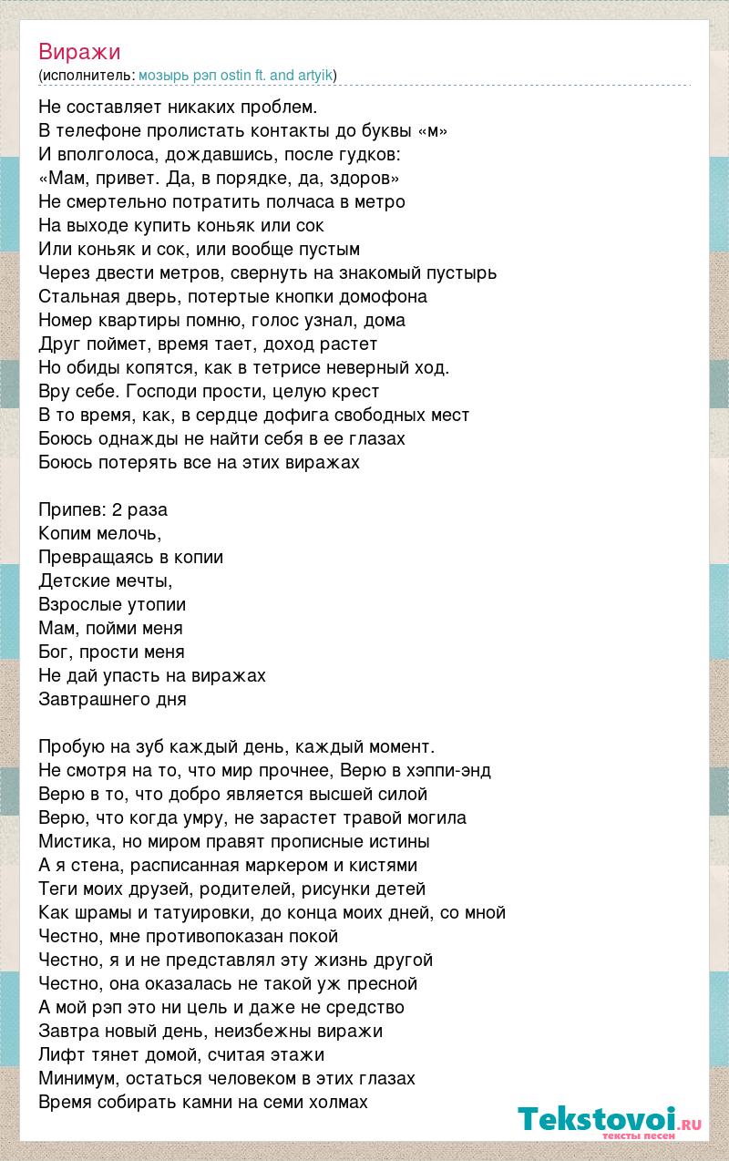 Не составляет никаких проблем. В телефоне пролистать контакты до буквы «м» И вполголоса, дождавшись, после гудков: «Мам, привет. Да, в порядке, да, здоров» Не смертельно потратить полчаса в метро На выходе купить коньяк или сок Или коньяк и сок, или вообще пустым Через двести метров, свернуть на знакомый пустырь Стальная дверь, потертые кнопки домофона Номер квартиры помню, голос узнал, дома Друг поймет, время тает, доход растет Но обиды копятся, как в тетрисе неверный ход. Вру себе. Господи прости, целую крест В то время, как, в сердце дофига свободных мест Боюсь однажды не найти себя в ее глазах Боюсь потерять все на этих виражах Припев: 2 раза Копим мелочь, Превращаясь в копии Детские мечты, Взрослые утопии Мам, пойми меня Бог, прости меня Не дай упасть на виражах Завтрашнего дня Пробую на зуб каждый день, каждый момент. Не смотря на то, что мир прочнее, Верю в хэппи-энд Верю в то, что добро является высшей силой Верю, что когда умру, не зарастет травой могила Мистика, но миром правят прописные истины А я стена, расписанная маркером и кистями Теги моих друзей, родителей, рисунки детей Как шрамы и татуировки, до конца моих дней, со мной Честно, мне противопоказан покой Честно, я и не представлял эту жизнь другой Честно, она оказалась не такой уж пресной А мой рэп это ни цель и даже не средство Завтра новый день, неизбежны виражи Лифт тянет домой, считая этажи Минимум, остаться человеком в этих глазах Время собирать камни на семи холмах