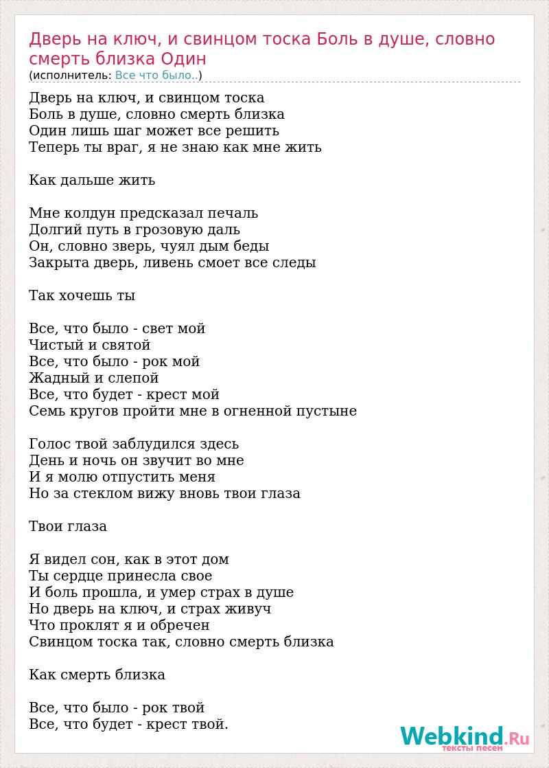Дверь на ключ, и свинцом тоска Боль в душе, словно смерть близка Один лишь шаг может все решить Теперь ты враг, я не знаю как мне жить Как дальше жить Мне колдун предсказал печаль Долгий путь в грозовую даль Он, словно зверь, чуял дым беды Закрыта дверь, ливень смоет все следы Так хочешь ты Все, что было - свет мой Чистый и святой Все, что было - рок мой Жадный и слепой Все, что будет - крест мой Семь кругов пройти мне в огненной пустыне Голос твой заблудился здесь День и ночь он звучит во мне И я молю отпустить меня Но за стеклом вижу вновь твои глаза Твои глаза Я видел сон, как в этот дом Ты сердце принесла свое И боль прошла, и умер страх в душе Но дверь на ключ, и страх живуч Что проклят я и обречен Свинцом тоска так, словно смерть близка Как смерть близка Все, что было - рок твой Все, что будет - крест твой.
