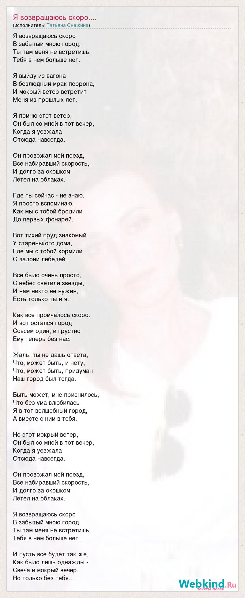 Я возвращаюсь скоро В забытый мною город, Ты там меня не встретишь, Тебя в нем больше нет. Я выйду из вагона В безлюдный мрак перрона, И мокрый ветер встретит Меня из прошлых лет. Я помню этот ветер, Он был со мной в тот вечер, Когда я уезжала Отсюда навсегда. Он провожал мой поезд, Все набиравший скорость, И долго за окошком Летел на облаках. Где ты сейчас - не знаю. Я просто вспоминаю, Как мы с тобой бродили До первых фонарей. Вот тихий пруд знакомый У старенького дома, Где мы с тобой кормили С ладони лебедей. Все было очень просто, С небес светили звезды, И нам никто не нужен, Есть только ты и я. Как все промчалось скоро. И вот остался город Совсем один, и грустно Ему теперь без нас. Жаль, ты не дашь ответа, Что, может быть, и нету, Что, может быть, придуман Наш город был тогда. Быть может, мне приснилось, Что без ума влюбилась Я в тот волшебный город, А вместе с ним в тебя. Но этот мокрый ветер, Он был со мной в тот вечер, Когда я уезжала Отсюда навсегда. Он провожал мой поезд, Все набиравший скорость, И долго за окошком Летел на облаках. Я возвращаюсь скоро В забытый мною город. Ты там меня не встретишь, Тебя в нем больше нет. И пусть все будет так же, Как было лишь однажды - Свеча и мокрый вечер, Но только без тебя...