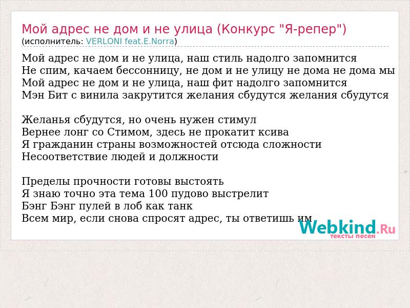 Мой адрес не дом и не улица, наш стиль надолго запомнится Не спим, качаем бессонницу, не дом и не улицу не дома не дома мы Мой адрес не дом и не улица, наш фит надолго запомнится Мэн Бит с винила закрутится желания сбудутся желания сбудутся Желанья сбудутся, но очень нужен стимул Вернее лонг со Стимом, здесь не прокатит ксива Я гражданин страны возможностей отсюда сложности Несоответствие людей и должности Пределы прочности готовы выстоять Я знаю точно эта тема 100 пудово выстрелит Бэнг Бэнг пулей в лоб как танк Всем мир, если снова спросят адрес, ты ответишь им