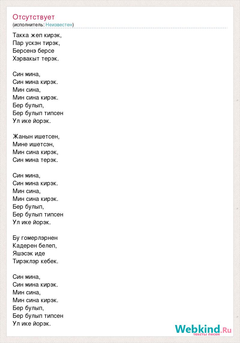 Такка жеп кирэк, Пар ускэн тирэк, Берсенэ берсе Хэрвакыт терэк. Син мина, Син мина кирэк. Мин сина, Мин сина кирэк. Бер булып, Бер булып типсен Ул ике йорэк. Жанын ишетсен, Мине ишетсэн, Мин сина кирэк, Син мина терэк. Син мина, Син мина кирэк. Мин сина, Мин сина кирэк. Бер булып, Бер булып типсен Ул ике йорэк. Бу гомерлэрнен Кадерен белеп, Яшэсэк иде Тирэклэр кебек. Син мина, Син мина кирэк. Мин сина, Мин сина кирэк. Бер булып, Бер булып типсен Ул ике йорэк.
