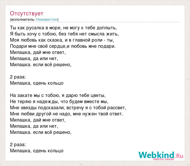 Ты как русалка в море, не могу к тебе доплыть, Я быть хочу с тобою, без тебя нет смысла жить, Моя любовь как сказка, и в главной роли - ты, Подари мне своё сердце,и любовь мне подари. Милашка, дай мне ответ, Милашка, да или нет, Милашка. если всё решено, 2 раза: Милашка, одень кольцо На закате мы с тобою, я дарю тебе цветы, Не теряю я надежды, что будем вместе мы, Мне звезды подсказали, встречу я с тобой рассвет, Мне любви другой не надо, мне нужен твой ответ. Милашка, дай мне ответ, Милашка, да или нет, Милашка. если всё решено, 2 раза: Милашка, одень кольцо