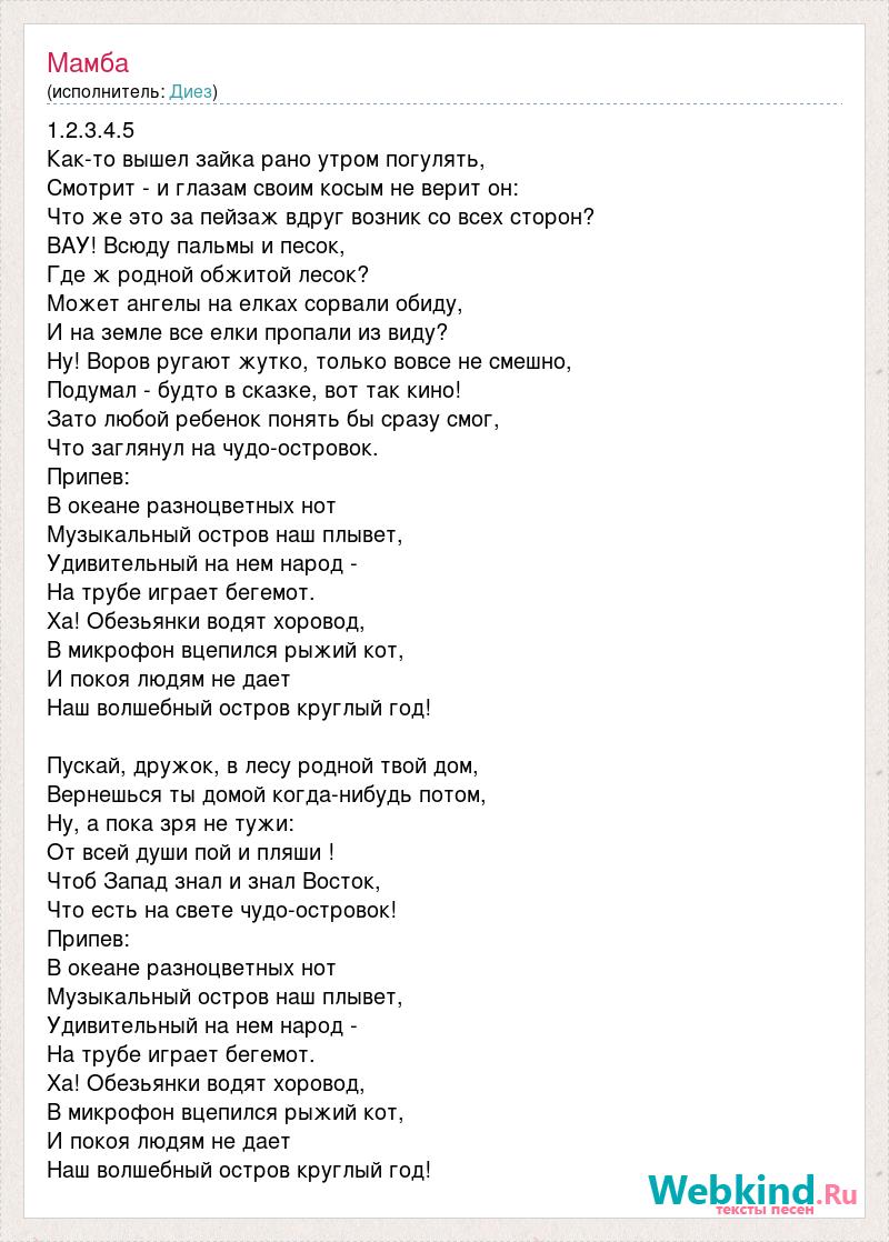 1.2.3.4.5 Как-то вышел зайка рано утром погулять, Смотрит - и глазам своим косым не верит он: Что же это за пейзаж вдруг возник со всех сторон? ВАУ! Всюду пальмы и песок, Где ж родной обжитой лесок? Может ангелы на елках сорвали обиду, И на земле все елки пропали из виду? Ну! Воров ругают жутко, только вовсе не смешно, Подумал - будто в сказке, вот так кино! Зато любой ребенок понять бы сразу смог, Что заглянул на чудо-островок. Припев: В океане разноцветных нот Музыкальный остров наш плывет, Удивительный на нем народ - На трубе играет бегемот. Ха! Обезьянки водят хоровод, В микрофон вцепился рыжий кот, И покоя людям не дает Наш волшебный остров круглый год! Пускай, дружок, в лесу родной твой дом, Вернешься ты домой когда-нибудь потом, Ну, а пока зря не тужи: От всей души пой и пляши ! Чтоб Запад знал и знал Восток, Что есть на свете чудо-островок! Припев: В океане разноцветных нот Музыкальный остров наш плывет, Удивительный на нем народ - На трубе играет бегемот. Ха! Обезьянки водят хоровод, В микрофон вцепился рыжий кот, И покоя людям не дает Наш волшебный остров круглый год!