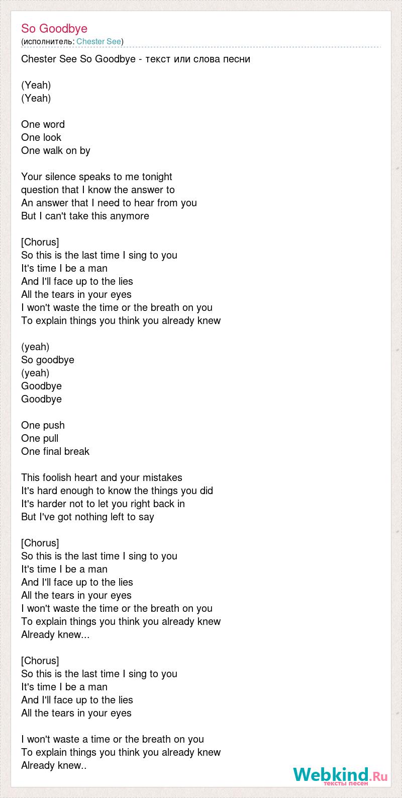 Chester See So Goodbye - текст или слова песни (Yeah) (Yeah) One word One look One walk on by Your silence speaks to me tonight question that I know the answer to An answer that I need to hear from you But I can't take this anymore [Chorus] So this is the last time I sing to you It's time I be a man And I'll face up to the lies All the tears in your eyes I won't waste the time or the breath on you To explain things you think you already knew (yeah) So goodbye (yeah) Goodbye Goodbye One push One pull One final break This foolish heart and your mistakes It's hard enough to know the things you did It's harder not to let you right back in But I've got nothing left to say [Chorus] So this is the last time I sing to you It's time I be a man And I'll face up to the lies All the tears in your eyes I won't waste the time or the breath on you To explain things you think you already knew Already knew... [Chorus] So this is the last time I sing to you It's time I be a man And I'll face up to the lies All the tears in your eyes I won't waste a time or the breath on you To explain things you think you already knew Already knew..