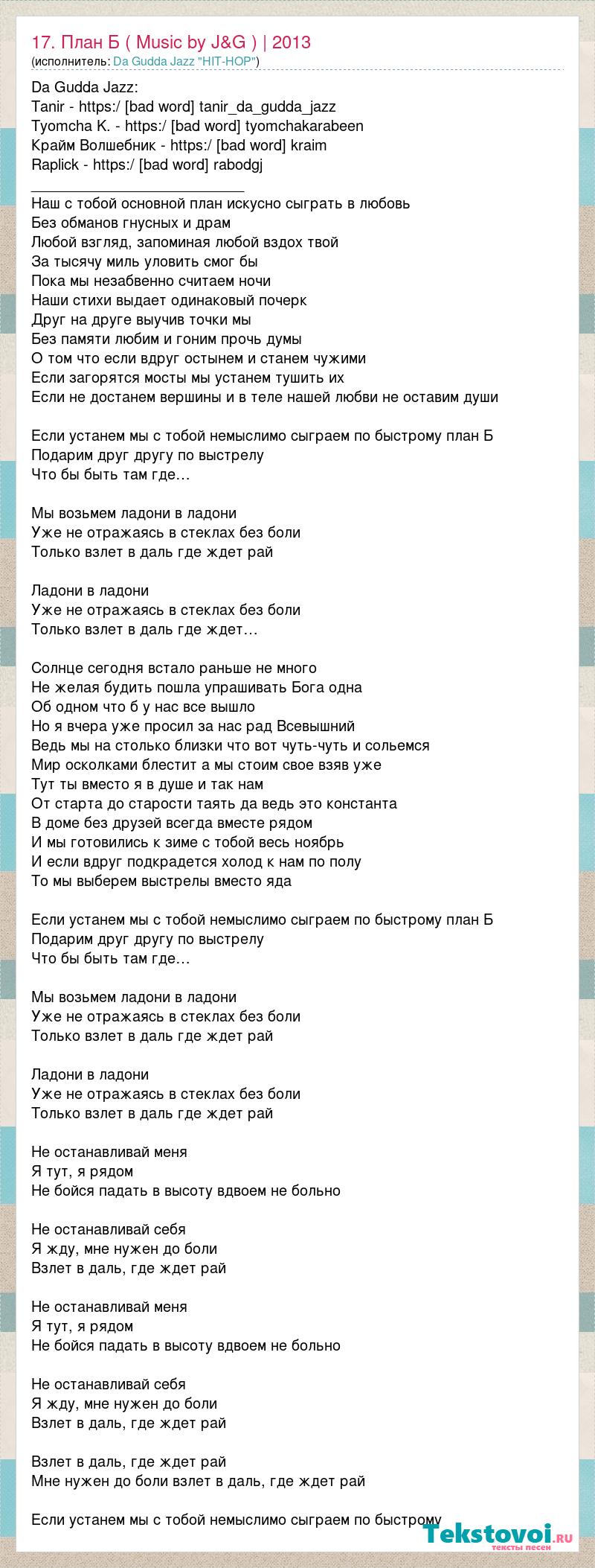 Da Gudda Jazz: Tanir - https:/ [bad word] tanir_da_gudda_jazz Tyomcha K. - https:/ [bad word] tyomchakarabeen Крайм Волшебник - https:/ [bad word] kraim Raplick - https:/ [bad word] rabodgj __________________________ Наш с тобой основной план искусно сыграть в любовь Без обманов гнусных и драм Любой взгляд, запоминая любой вздох твой За тысячу миль уловить смог бы Пока мы незабвенно считаем ночи Наши стихи выдает одинаковый почерк Друг на друге выучив точки мы Без памяти любим и гоним прочь думы О том что если вдруг остынем и станем чужими Если загорятся мосты мы устанем тушить их Если не достанем вершины и в теле нашей любви не оставим души Если устанем мы с тобой немыслимо сыграем по быстрому план Б Подарим друг другу по выстрелу Что бы быть там где… Мы возьмем ладони в ладони Уже не отражаясь в стеклах без боли Только взлет в даль где ждет рай Ладони в ладони Уже не отражаясь в стеклах без боли Только взлет в даль где ждет… Солнце сегодня встало раньше не много Не желая будить пошла упрашивать Бога одна Об одном что б у нас все вышло Но я вчера уже просил за нас рад Всевышний Ведь мы на столько близки что вот чуть-чуть и сольемся Мир осколками блестит а мы стоим свое взяв уже Тут ты вместо я в душе и так нам От старта до старости таять да ведь это константа В доме без друзей всегда вместе рядом И мы готовились к зиме с тобой весь ноябрь И если вдруг подкрадется холод к нам по полу То мы выберем выстрелы вместо яда Если устанем мы с тобой немыслимо сыграем по быстрому план Б Подарим друг другу по выстрелу Что бы быть там где… Мы возьмем ладони в ладони Уже не отражаясь в стеклах без боли Только взлет в даль где ждет рай Ладони в ладони Уже не отражаясь в стеклах без боли Только взлет в даль где ждет рай Не останавливай меня Я тут, я рядом Не бойся падать в высоту вдвоем не больно Не останавливай себя Я жду, мне нужен до боли Взлет в даль, где ждет рай Не останавливай меня Я тут, я рядом Не бойся падать в высоту вдвоем не больно Не останавливай себя Я жду, мне нужен до боли Взлет в даль, где ждет рай Взлет в даль, где ждет рай Мне нужен до боли взлет в даль, где ждет рай Если устанем мы с тобой немыслимо сыграем по быстрому
