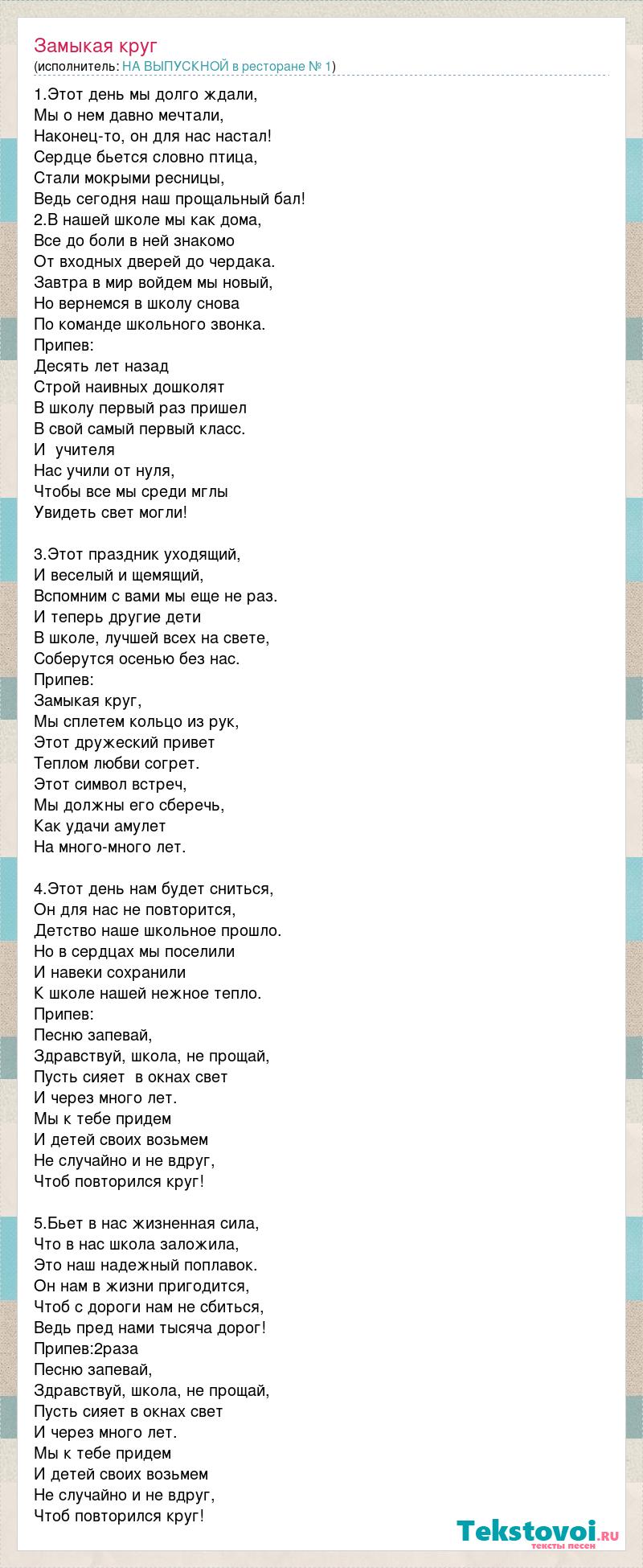 1.Этот день мы долго ждали, Мы о нем давно мечтали, Наконец-то, он для нас настал! Сердце бьется словно птица, Стали мокрыми ресницы, Ведь сегодня наш прощальный бал! 2.В нашей школе мы как дома, Все до боли в ней знакомо От входных дверей до чердака. Завтра в мир войдем мы новый, Но вернемся в школу снова По команде школьного звонка. Припев: Десять лет назад Строй наивных дошколят В школу первый раз пришел В свой самый первый класс. И учителя Нас учили от нуля, Чтобы все мы среди мглы Увидеть свет могли! 3.Этот праздник уходящий, И веселый и щемящий, Вспомним с вами мы еще не раз. И теперь другие дети В школе, лучшей всех на свете, Соберутся осенью без нас. Припев: Замыкая круг, Мы сплетем кольцо из рук, Этот дружеский привет Теплом любви согрет. Этот символ встреч, Мы должны его сберечь, Как удачи амулет На много-много лет. 4.Этот день нам будет сниться, Он для нас не повторится, Детство наше школьное прошло. Но в сердцах мы поселили И навеки сохранили К школе нашей нежное тепло. Припев: Песню запевай, Здравствуй, школа, не прощай, Пусть сияет в окнах свет И через много лет. Мы к тебе придем И детей своих возьмем Не случайно и не вдруг, Чтоб повторился круг! 5.Бьет в нас жизненная сила, Что в нас школа заложила, Это наш надежный поплавок. Он нам в жизни пригодится, Чтоб с дороги нам не сбиться, Ведь пред нами тысяча дорог! Припев:2раза Песню запевай, Здравствуй, школа, не прощай, Пусть сияет в окнах свет И через много лет. Мы к тебе придем И детей своих возьмем Не случайно и не вдруг, Чтоб повторился круг!
