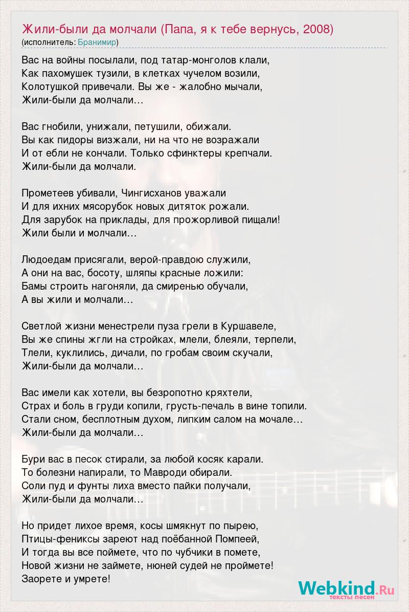 Вас на войны посылали, под татар-монголов клали, Как пахомушек тузили, в клетках чучелом возили, Колотушкой привечали. Вы же - жалобно мычали, Жили-были да молчали… Вас гнобили, унижали, петушили, обижали. Вы как пидоры визжали, ни на что не возражали И от ебли не кончали. Только сфинктеры крепчали. Жили-были да молчали. Прометеев убивали, Чингисханов уважали И для ихних мясорубок новых дитяток рожали. Для зарубок на приклады, для прожорливой пищали! Жили были и молчали… Людоедам присягали, верой-правдою служили, А они на вас, босоту, шляпы красные ложили: Бамы строить нагоняли, да смиренью обучали, А вы жили и молчали… Светлой жизни менестрели пуза грели в Куршавеле, Вы же спины жгли на стройках, млели, блеяли, терпели, Тлели, куклились, дичали, по гробам своим скучали, Жили-были да молчали… Вас имели как хотели, вы безропотно кряхтели, Страх и боль в груди копили, грусть-печаль в вине топили. Стали сном, бесплотным духом, липким салом на мочале… Жили-были да молчали… Бури вас в песок стирали, за любой косяк карали. То болезни напирали, то Мавроди обирали. Соли пуд и фунты лиха вместо пайки получали, Жили-были да молчали… Но придет лихое время, косы шмякнут по пырею, Птицы-фениксы зареют над поёбанной Помпеей, И тогда вы все поймете, что по чубчики в помете, Новой жизни не займете, нюней судей не проймете! Заорете и умрете!