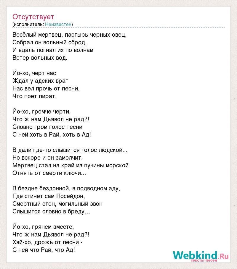 Весёлый мертвец, пастырь черных овец, Собрал он вольный сброд, И вдаль погнал их по волнам Ветер вольных вод. Йо-хо, черт нас Ждал у адских врат Нас вел прочь от песни, Что поет пират. Йо-хо, громче черти, Что ж нам Дьявол не рад?! Словно гром голос песни С ней хоть в Рай, хоть в Ад! В дали где-то слышится голос людской... Но вскоре и он замолчит. Мертвец стал на край из пучины морской Отнять от смерти ключи... В бездне бездонной, в подводном аду, Где сгинет сам Посейдон, Смертный стон, могильный звон Слышится словно в бреду… Йо-хо, грянем вместе, Что ж нам Дьявол не рад?! Хэй-хо, дрожь от песни - С ней что Рай, что Ад!
