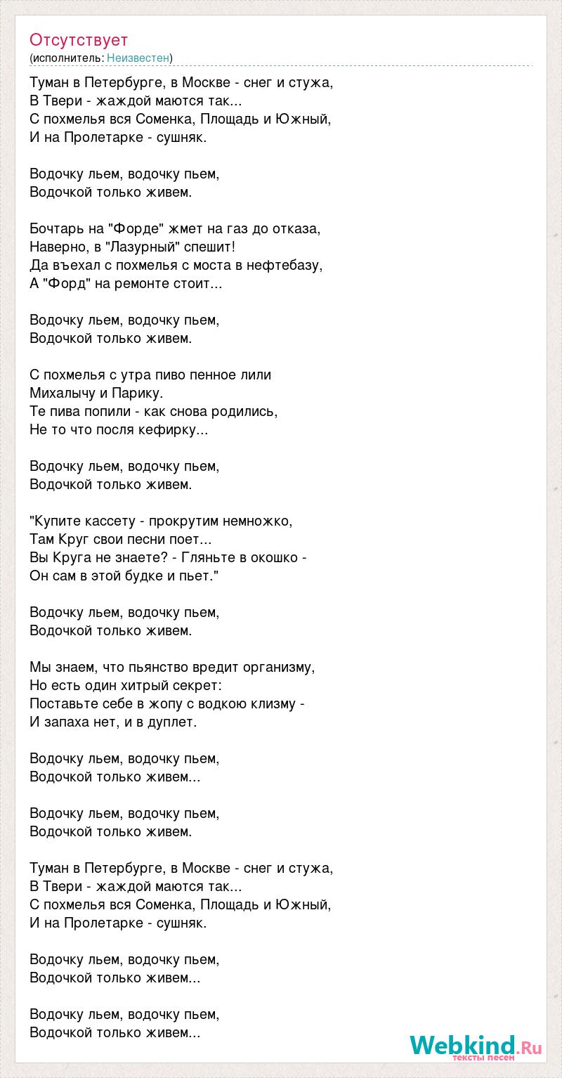 Туман в Петербурге, в Москве - снег и стужа, В Твери - жаждой маются так... С похмелья вся Соменка, Площадь и Южный, И на Пролетарке - сушняк. Водочку льем, водочку пьем, Водочкой только живем. Бочтарь на "Форде" жмет на газ до отказа, Наверно, в "Лазурный" спешит! Да въехал с похмелья с моста в нефтебазу, А "Форд" на ремонте стоит... Водочку льем, водочку пьем, Водочкой только живем. С похмелья с утра пиво пенное лили Михалычу и Парику. Те пива попили - как снова родились, Не то что посля кефирку... Водочку льем, водочку пьем, Водочкой только живем. "Купите кассету - прокрутим немножко, Там Круг свои песни поет... Вы Круга не знаете? - Гляньте в окошко - Он сам в этой будке и пьет." Водочку льем, водочку пьем, Водочкой только живем. Мы знаем, что пьянство вредит организму, Но есть один хитрый секрет: Поставьте себе в жопу с водкою клизму - И запаха нет, и в дуплет. Водочку льем, водочку пьем, Водочкой только живем... Водочку льем, водочку пьем, Водочкой только живем. Туман в Петербурге, в Москве - снег и стужа, В Твери - жаждой маются так... С похмелья вся Соменка, Площадь и Южный, И на Пролетарке - сушняк. Водочку льем, водочку пьем, Водочкой только живем... Водочку льем, водочку пьем, Водочкой только живем...