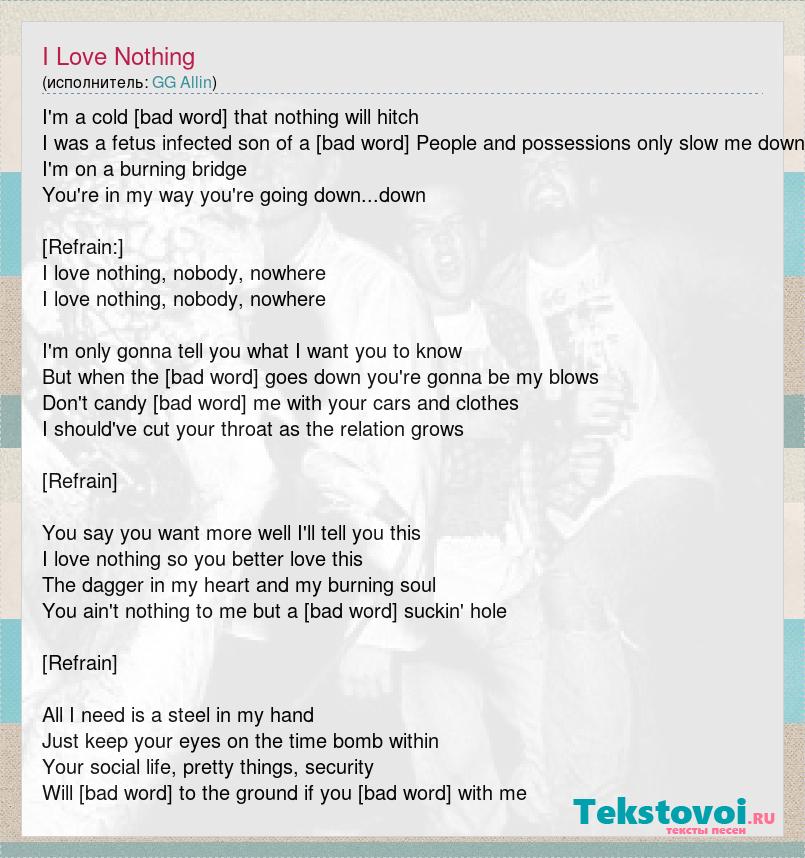 I'm a cold [bad word] that nothing will hitch I was a fetus infected son of a [bad word] People and possessions only slow me down I'm on a burning bridge You're in my way you're going down...down [Refrain:] I love nothing, nobody, nowhere I love nothing, nobody, nowhere I'm only gonna tell you what I want you to know But when the [bad word] goes down you're gonna be my blows Don't candy [bad word] me with your cars and clothes I should've cut your throat as the relation grows [Refrain] You say you want more well I'll tell you this I love nothing so you better love this The dagger in my heart and my burning soul You ain't nothing to me but a [bad word] suckin' hole [Refrain] All I need is a steel in my hand Just keep your eyes on the time bomb within Your social life, pretty things, security Will crumble to the ground if you [bad word] with me