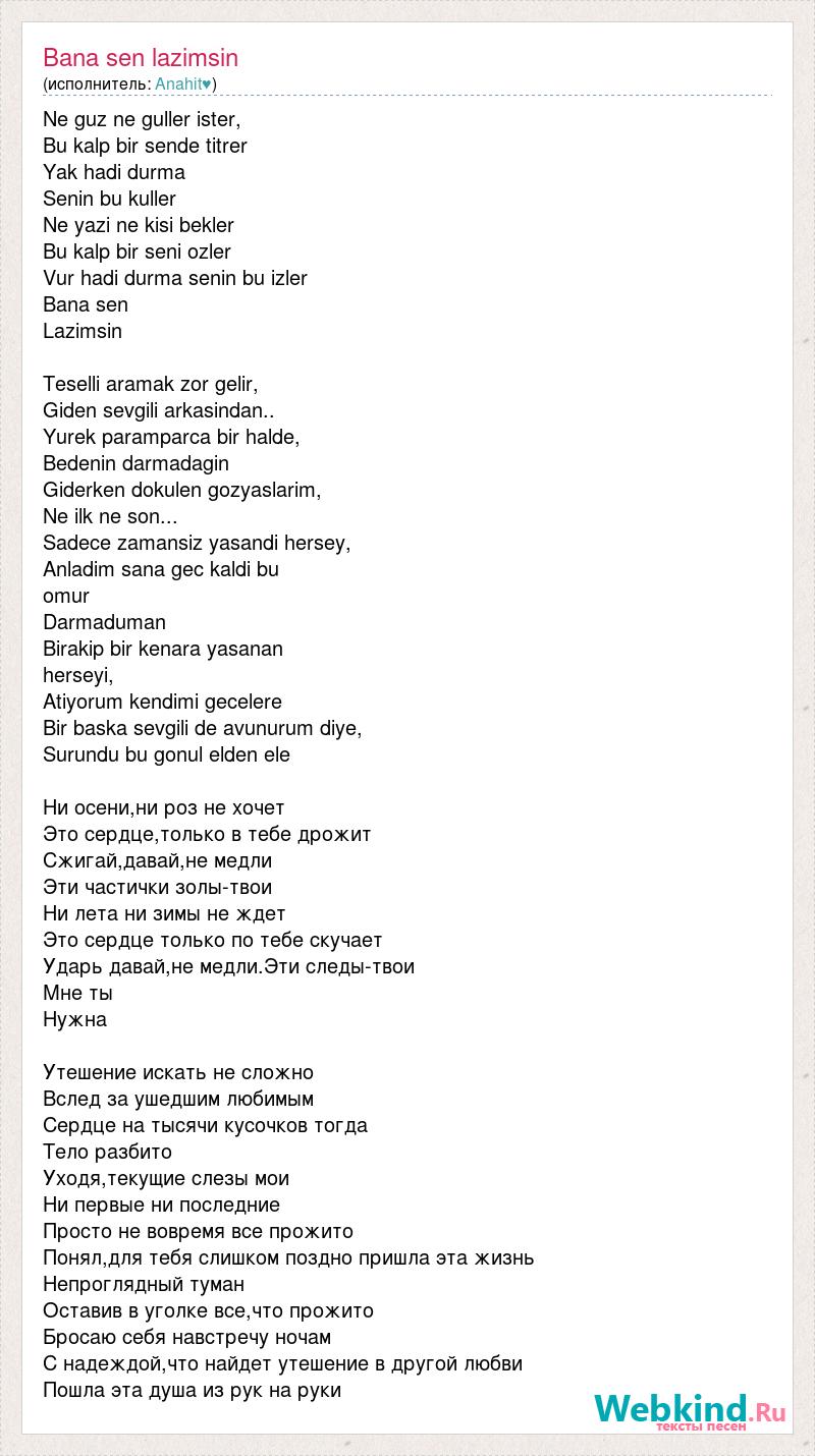 Ne guz ne guller ister, Bu kalp bir sende titrer Yak hadi durma Senin bu kuller Ne yazi ne kisi bekler Bu kalp bir seni ozler Vur hadi durma senin bu izler Bana sen Lazimsin Teselli aramak zor gelir, Giden sevgili arkasindan.. Yurek paramparca bir halde, Bedenin darmadagin Giderken dokulen gozyaslarim, Ne ilk ne son... Sadece zamansiz yasandi hersey, Anladim sana gec kaldi bu omur Darmaduman Birakip bir kenara yasanan herseyi, Atiyorum kendimi gecelere Bir baska sevgili de avunurum diye, Surundu bu gonul elden ele Ни осени,ни роз не хочет Это сердце,только в тебе дрожит Сжигай,давай,не медли Эти частички золы-твои Ни лета ни зимы не ждет Это сердце только по тебе скучает Ударь давай,не медли.Эти следы-твои Мне ты Нужна Утешение искать не сложно Вслед за ушедшим любимым Сердце на тысячи кусочков тогда Тело разбито Уходя,текущие слезы мои Ни первые ни последние Просто не вовремя все прожито Понял,для тебя слишком поздно пришла эта жизнь Непроглядный туман Оставив в уголке все,что прожито Бросаю себя навстречу ночам С надеждой,что найдет утешение в другой любви Пошла эта душа из рук на руки