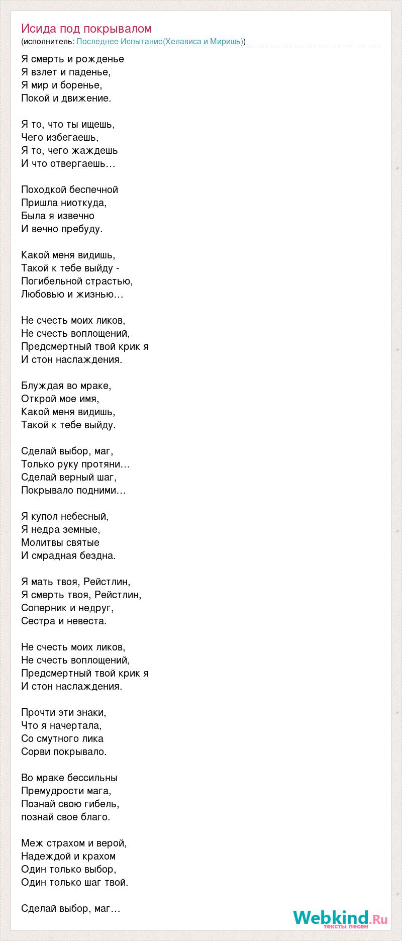 Я смерть и рожденье Я взлет и паденье, Я мир и боренье, Покой и движение. Я то, что ты ищешь, Чего избегаешь, Я то, чего жаждешь И что отвергаешь… Походкой беспечной Пришла ниоткуда, Была я извечно И вечно пребуду. Какой меня видишь, Такой к тебе выйду - Погибельной страстью, Любовью и жизнью… Не счесть моих ликов, Не счесть воплощений, Предсмертный твой крик я И стон наслаждения. Блуждая во мраке, Открой мое имя, Какой меня видишь, Такой к тебе выйду. Сделай выбор, маг, Только руку протяни… Сделай верный шаг, Покрывало подними… Я купол небесный, Я недра земные, Молитвы святые И смрадная бездна. Я мать твоя, Рейстлин, Я смерть твоя, Рейстлин, Соперник и недруг, Сестра и невеста. Не счесть моих ликов, Не счесть воплощений, Предсмертный твой крик я И стон наслаждения. Прочти эти знаки, Что я начертала, Со смутного лика Сорви покрывало. Во мраке бессильны Премудрости мага, Познай свою гибель, познай свое благо. Меж страхом и верой, Надеждой и крахом Один только выбор, Один только шаг твой. Сделай выбор, маг…