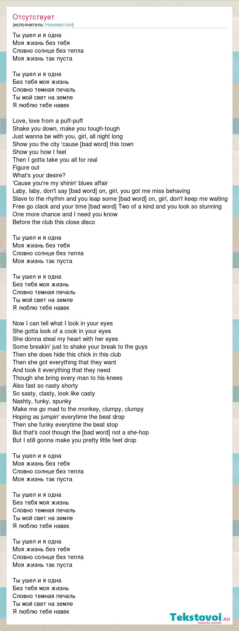 Ты ушел и я одна Моя жизнь без тебя Словно солнце без тепла Моя жизнь так пуста Ты ушел и я одна Без тебя моя жизнь Словно темная печаль Ты мой свет на земле Я люблю тебя навек Love, love from a puff-puff Shake you down, make you tough-tough Just wanna be with you, girl, all night long Show you the city 'cause you run this town Show you how I feel Then I gotta take you all for real Figure out What's your desire? 'Cause you're my shinin' blues affair Laby, laby, don't say "maybe" Come on, girl, you got me miss behaving Slave to the rhythm and you leap some craving Come on, girl, don't keep me waiting Free go clack and your time is running Two of a kind and you look so stunning One more chance and I need you know Before the club this close disco Ты ушел и я одна Моя жизнь без тебя Словно солнце без тепла Моя жизнь так пуста Ты ушел и я одна Без тебя моя жизнь Словно темная печаль Ты мой свет на земле Я люблю тебя навек Now I can tell what I look in your eyes She gotta look of a cook in your eyes She donna steal my heart with her eyes Some breakin' just to shake your break to the guys Then she does hide this chick in this club Then she got everything that they want And took it everything that they need Though she bring every man to his knees Also fast so nasty shorty So sasty, clasty, look like casty Nashty, funky, spunky Make me go mad to the monkey, clumpy, clumpy Hoping as jumpin' everytime the beat drop Then she funky everytime the beat stop But that's cool though the strudy not a she-hop But I still gonna make you pretty little feet drop Ты ушел и я одна Моя жизнь без тебя Словно солнце без тепла Моя жизнь так пуста Ты ушел и я одна Без тебя моя жизнь Словно темная печаль Ты мой свет на земле Я люблю тебя навек Ты ушел и я одна Моя жизнь без тебя Словно солнце без тепла Моя жизнь так пуста Ты ушел и я одна Без тебя моя жизнь Словно темная печаль Ты мой свет на земле Я люблю тебя навек